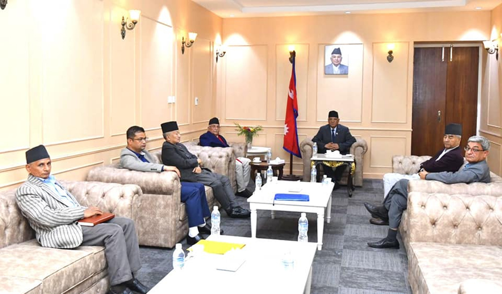 काठमाडौं । प्रमुख तीन दलका शीर्ष नेताबीच प्रधानमन्त्री कार्यालयमा समसामयिक विषयमा भएको छलफल जारी छ ।