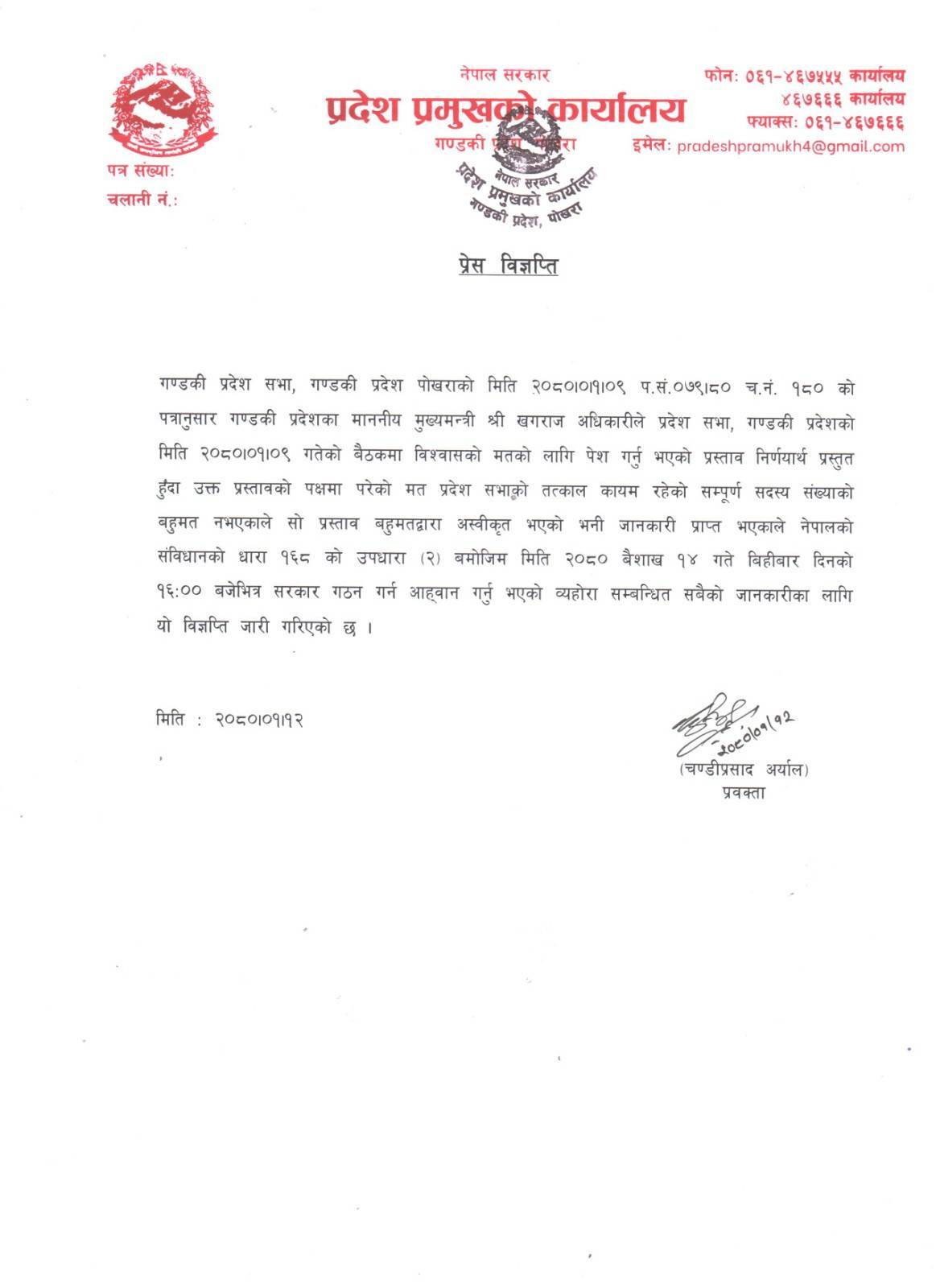 मुख्यमन्त्री खगराज अधिकारीले वैशाख ९ गते सदनबाट विश्वासको मत पाउन नसकेपछि प्रदेश प्रमुख गुरुङ नयाँ सरकार गठनका लागि वैशाख १४ गते दिउँसो ४ बजेसम्मको समय दिएका छन् ।