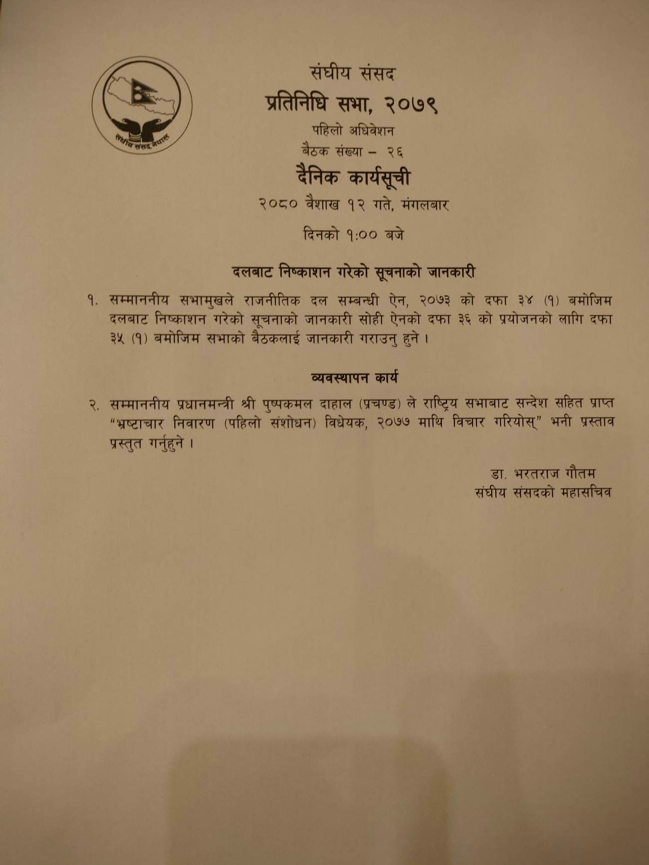 आज मंगलबार बस्ने प्रतिनिधिसभा बैठकमा सभामुख देवराज घिमिरेले उनको सांसद पद रिक्त भएको जानकारी सुनाउने तय भएको छ ।
