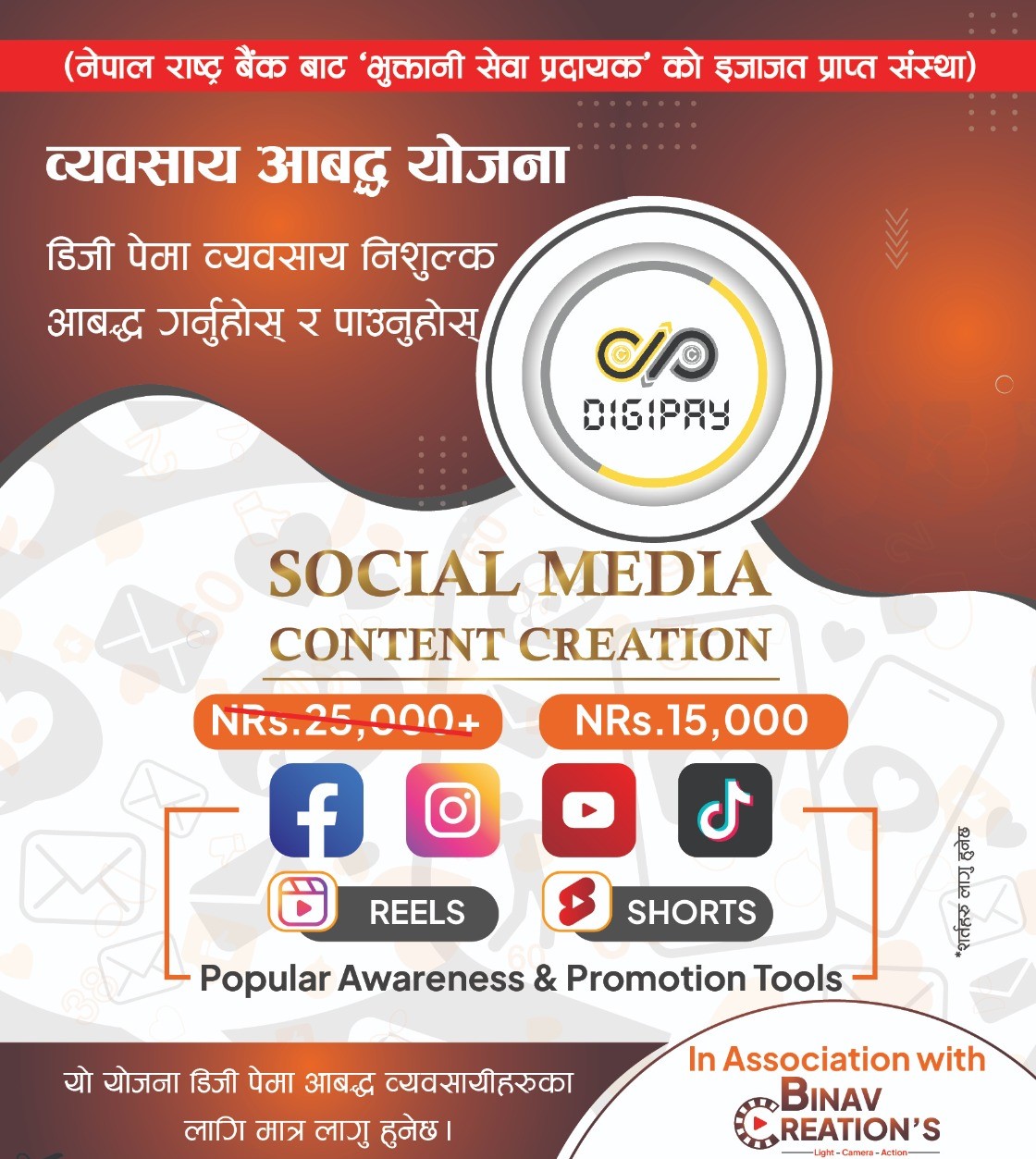 सम्झौता अनुसार डीजी पेको व्यवसायीक आवद्ध योजना अनुरुप डीजी पे सँग आवद्ध हुने व्यवसायीले टिक टक, फेसबुक, इन्स्टाग्राम, युट्युब जस्तोसामाजिक संजालका लागी सुपथ मूल्यमा भीडियो बनाउन पाउने भएका छन् ।
