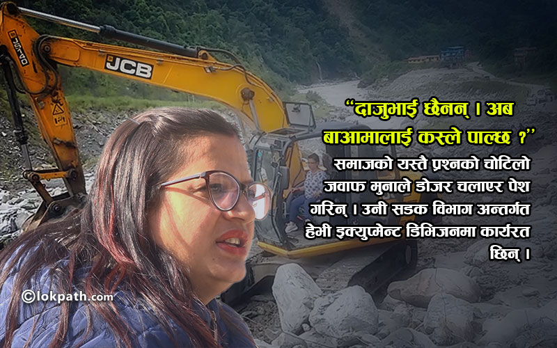 हामी नयाँ बानेश्वरस्थित हेभी इक्युपमेन्ट डिभिजन पुग्दा उनी सरकारी कर्मचारीको पोसाकमा चिटिक्क देखिएकी थिइन् । हेर्दा हेभी इक्युप्मेन्ट अपरेट गर्न सक्छिन् जस्तै नलाग्ने । उनलाई देखेपछि ‘शक्ति शरीरमा होइन दिमागमा हुन्छ’ उनी आफैले भनिरहने यो भनाइ साँच्चै हो जस्तो लाग्यो ।