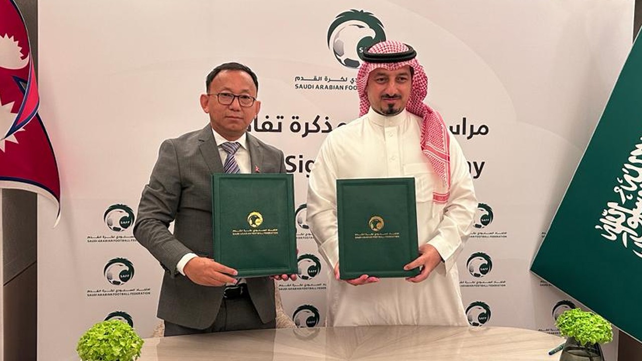 साउदी भ्रमणमा रहेका एन्फा अध्यक्ष पंकज विक्रम नेम्वाङ र साउदी अरेबिया फुटबलका अध्यक्ष यासेर अल मिसेहलले सम्झौता पत्रमा हस्ताक्षर गरेका छन् ।