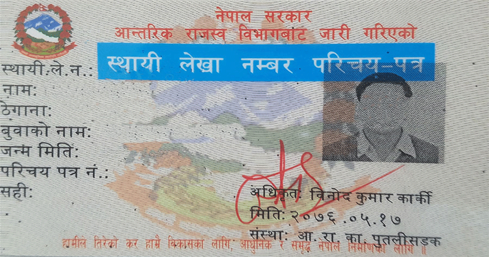 काठमाडौं । नागरिकता वा राष्ट्रिय परिचयपत्र लिँदाकै बखत सबै नागरिकलाई स्थायी लेखा नम्बर पान जारी गर्ने सरकारको योजना अझै कार्यान्वयनमा आउन सकेको छैन ।