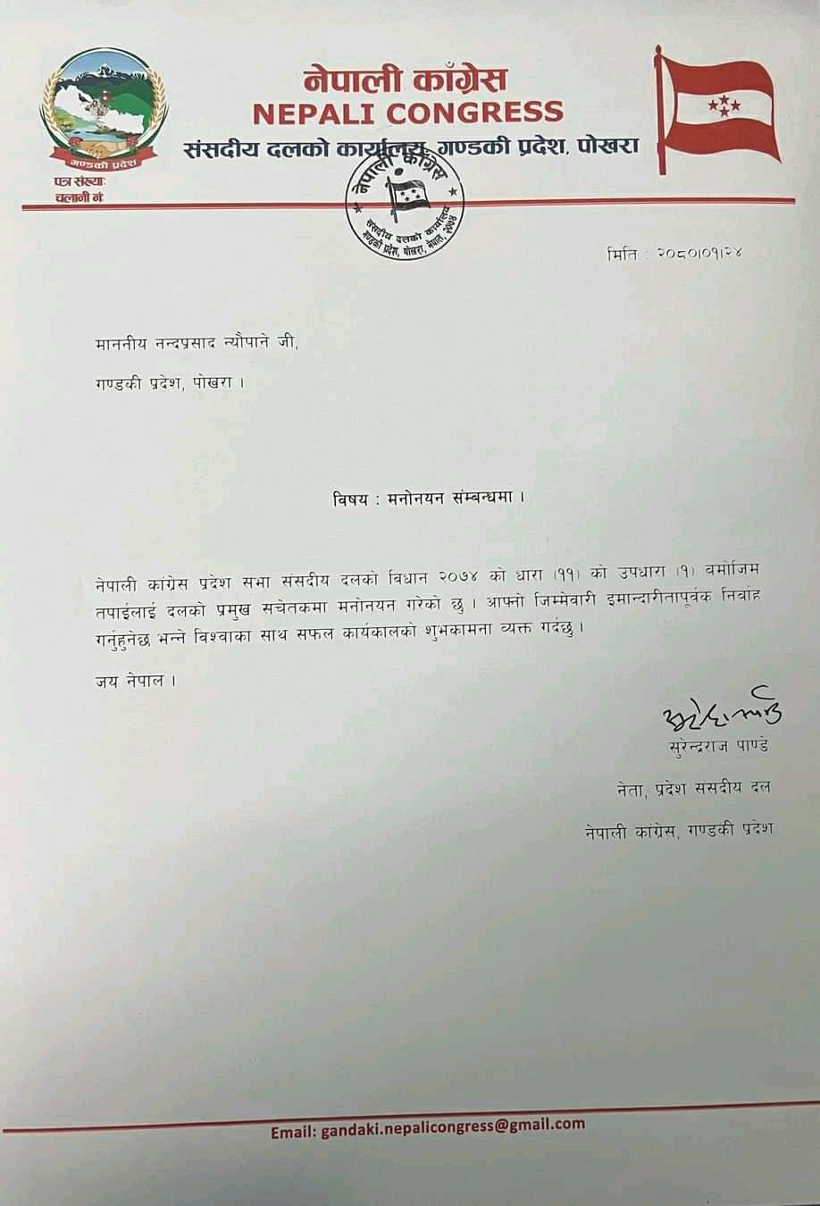 गण्डकी प्रदेशका मुख्यमन्त्री समेत रहेका नेपाली कांग्रेस संसदीय दलका नेता सुरेन्द्रराज पाण्डेले उनलाई सो जिम्मेवारी दिएका हुन् ।