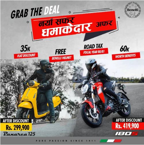 यो अफर बेनेली मोटरसाइकल र स्कुटरमा लागूहुने कम्पनीले जानकारी दिएको छ । कम्पनीका अनुसार यस अफरमा ग्राहकहरुले ६० हजार रुपैयाँसम्म छुट पाउन सक्नेछन्, यसमा नगद छुट ३५ हजार रुपैयाँ, बेनेली ब्राण्डको १२ हजार रुपैयाँ बराबरको हेल्मेट, एफवाई २०८०\८१ को रोड ट्याक्स सहुलियत तथा अन्य आकर्षक उपहारहरु हुनेछन् । बेनेली नेपालले निम्न मोडलका मोटरसाइकलहरु उपलव्ध गराउदै आएको जानकारी पनि कम्पनीले दिएको छ ।