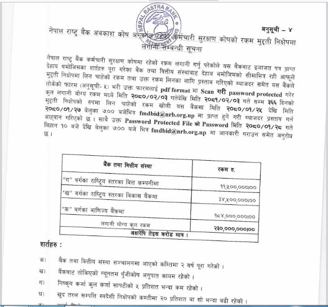 राष्ट्र बैंकका अनुसार रकम लगानीको लागि प्रस्ताव पेस गर्ने बैंक तथा फाईनान्स कम्पनीहरु सञ्चालनमा आएको कम्तीमा दुई बर्ष पुरा गरेको, तोकिएको न्यूनतम पूँजीकोष कायम रहेको, निष्कृय कर्जा (एन.पी.ए) कुल कर्जा सापटको पाँच प्रतिशत भन्दा कम भएको खुद तरल सम्पत्ति स्वदेशी निक्षेपको कम्तिमा २० प्रतिशत वा सो भन्दा बढी रहेको हुुनुुपर्ने लगायतका न्युनतम शर्तहरु तोकिएका छन् ।