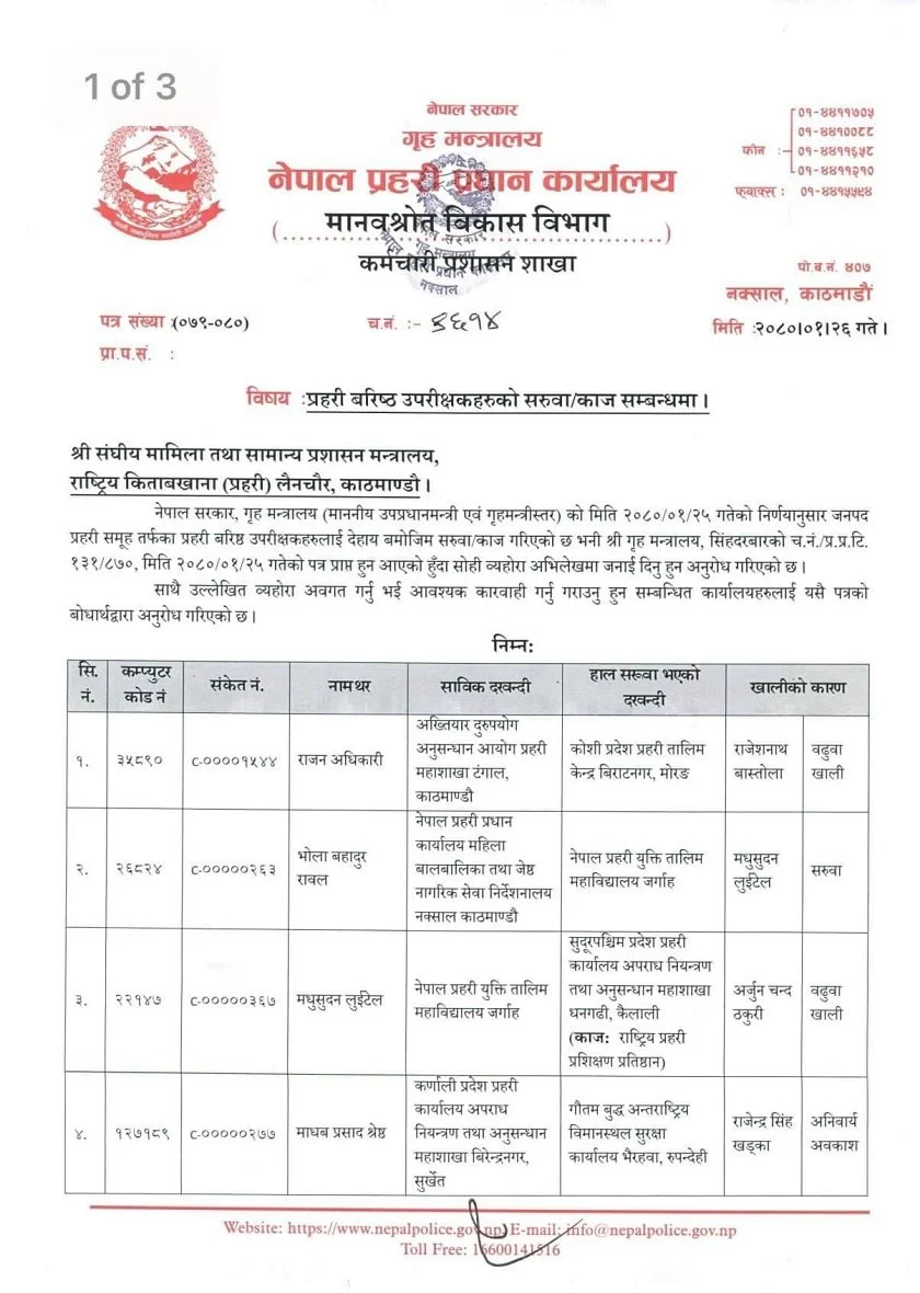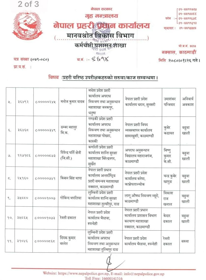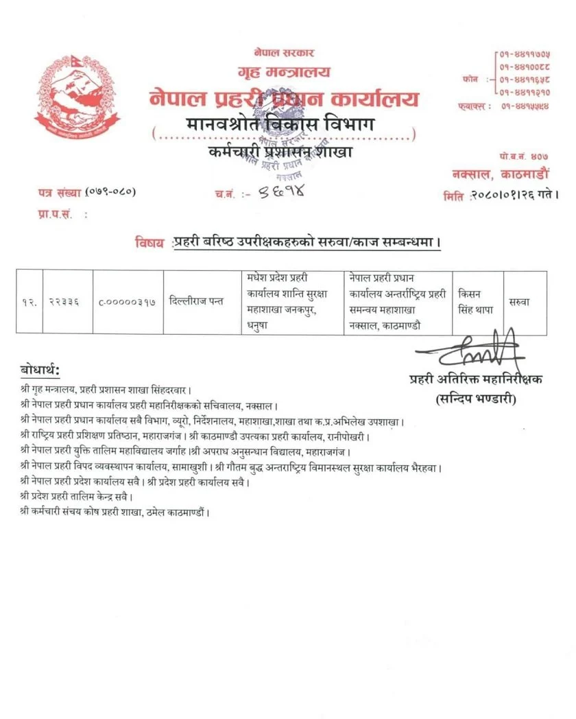 प्रहरी प्रधान कार्यालयले राजन अधिकारी, भोलाबहादुर राबल, मधुसुदन लुईटेल, माधवप्रसाद श्रेष्ठ, मनोज कुमार यादव, डम्बर बहादुर बिक, दिपेन्द्र घर्ती क्षेत्री (जिसी), किसनसिंह थापा, रेवती ढकाल, दिपककुमार बस्नेत र दिल्लीराज पन्तको सरुवा गराएको हो ।