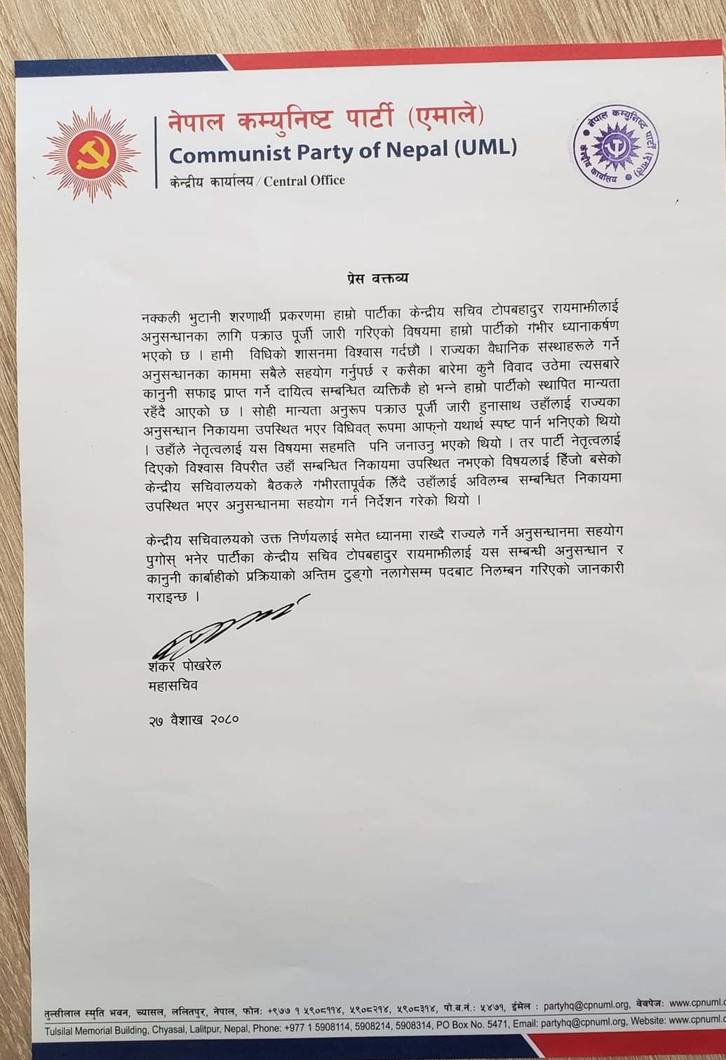 ‘राज्यले गर्ने अनुसन्धानमा सहयोग पुगोस् भनेर पार्टीका केन्द्रीय सचिव टोपबहादुर रायमाझीलाई यस सम्बन्धी अनुसन्धान र कानुनी कारबाहीको प्रक्रियाको अन्तिम टुंगो नलागेसम्म पदबाट निलम्बन गरिएको जानकारी गराइन्छ ।’ जारी विज्ञप्तिमा भनिएको छ ।