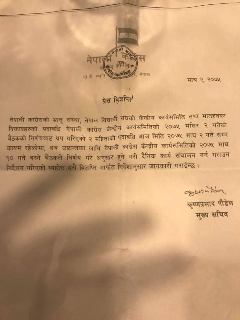 काङ्ग्रेस केन्द्रीय कार्यसमितिको गत मङ्सिर २ गतेको बैठकको निर्णयबाट नेविसङ्घ केन्द्रीय समितिको थप गरिएको दुई महीनाको पदावधि आज माघ २ गतेसम्म कायम थियो । काङ्ग्रेसले सङ्घ केन्द्रीय समिति तथा मातहतका निकायको पदावधि आजसम्म मात्र भए पनि अब उप्रान्तका लागि काङ्ग्रेस केन्द्रीय कार्यसमितिको आगामी माघ १० गते बस्ने बैठकले निर्णय गरेअनुसार हुने गरी दैनिक कार्य सञ्चालन गर्न गराउन निर्देशन दिएको हो । काङ्ग्रेस केन्द्रीय समितिको बैठक माघ १० गतेका लागि बोलाइएको छ ।