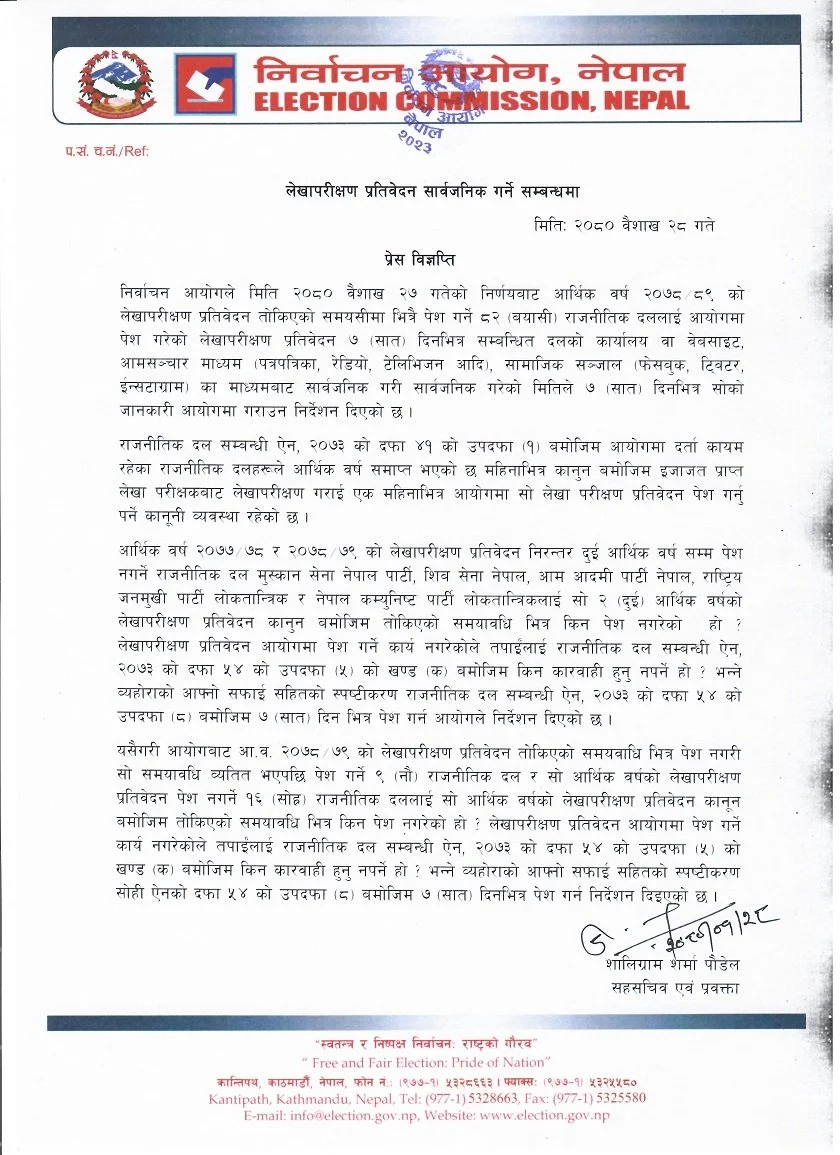 राजनीतिक दल सम्बन्धी ऐन, २०७३ को दफा ४१ को उपदफा (१) बमोजिम आयोगमा दर्ता कायम रहेका राजनीतिक दलहरुले आर्थिक बर्ष समाप्त भएको ६ महिनाभित्र कानुन बमोजिम इजाजत प्राप्त लेखा परीक्षकबाट लेखा परीक्षण गराई एक महिनाभित्र आयोगमा सो लेखा परीक्षणको प्रतिवेदन पेश गर्नुपर्ने कानुनी व्यवस्थाको स्मरण समेत गराएको छ ।