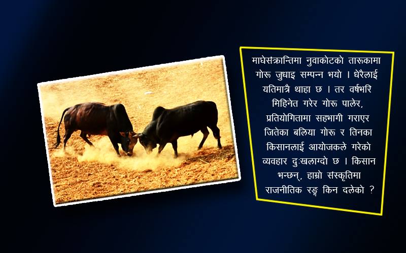 स्थानिय कला र संस्कृति राष्ट्रिय महत्व र चासोको विषय बनिरहेका बेला बर्षभरी दुख गरेर गोरु तयार पार्ने किसानको लागि आएको बजेटमा राजनीतिक रंग दिनु आफैमा अमर्यादित भएको भन्दै सामाजिक सञ्जालमा समेत व्यंग्य भइरहेको छ ।