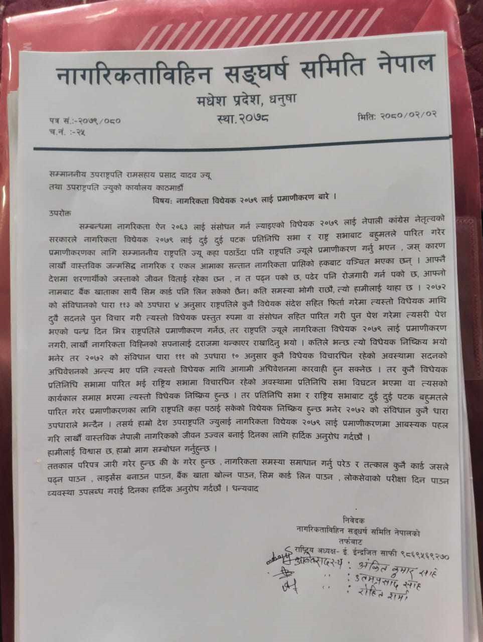 ‘प्रतिनिधि र राष्ट्रिय सभाबाट दुई दुईपटक बहुमतले पारित गरेर प्रमाणीकरणका लागि राष्ट्रपति कहाँ पठाइसकेको विद्येयक निष्कृय हुन्छ भनेर २०७२ को संविधानको कुनै धारा उपधाराले मान्दैन । तसर्थ हाम्रो देश उपराष्ट्रपति ज्यूलाई नागरिकता विद्येयक २०७९ लाई प्रमाणीकरणमा आवश्यक पहल गरी लाखाँै वास्तविक नेपाली नागरिकको जीवन उज्वल बनाईदिनका लागि अनुरोध गर्दछौँ ।’ ज्ञापनपत्रमा भनिएको छ ।