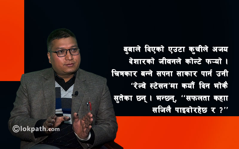 अजय देशारले सानैमा आमाको ममता गुमाए पनि आफूलाई सम्हाल्दै हुर्के । उनी अहिले पनि सम्झन्छन्, किशोरावस्थामा झुटो आरोपमा उनले पिटाई समेत खानुपर्यो । कठिनाई, अप्ठेराहरु आफ्नै ठाउँमा छन् । निरन्तर संघर्ष गर्न पछि नहटेका कारण नै उनको मिहेनत र आत्मविश्वासले आज उनी नेपालको एक सफल चित्रकार बन्न सफल भएका हुन् । चित्रकलामा आफ्नो सम्पूर्ण जीवन सुम्पेका उनी भन्छन्, चित्रकारहरु आफैँ हाकिम हुन् । आफैँ नोकर पनि । त्यो उहाँहरुको खुबि हो ।”