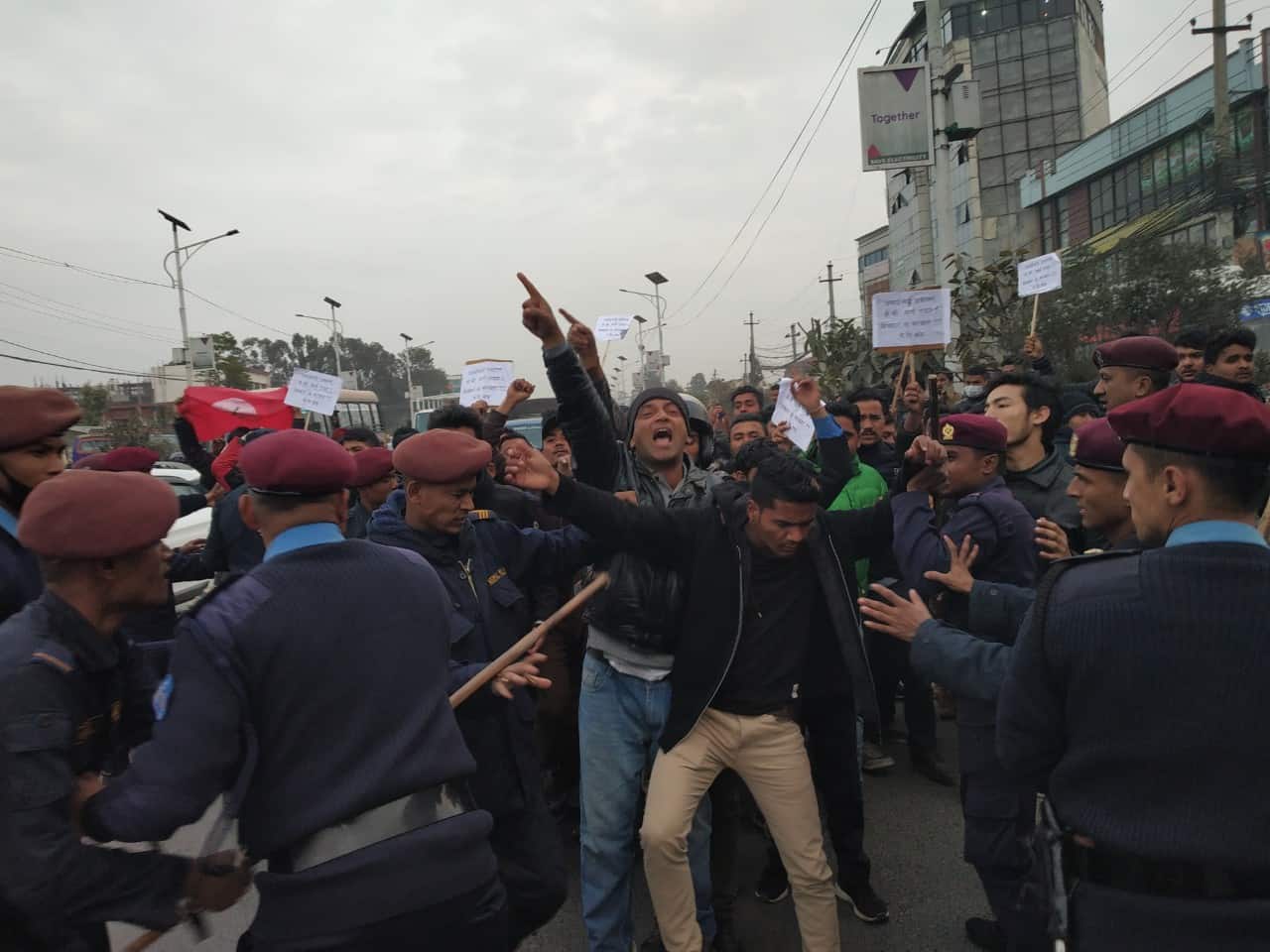 नेविसंघका महामन्त्री काफ्लेको नेतृत्वमा निस्केको बिद्यार्थीहरुको समूह र प्रहरी बिच  प्रदर्शनका क्रममा  झडप भएको हो। निषेधित क्षेत्र तोड्ने क्रममा प्रहरीले उनीहरुलाई रोकेको थियो।