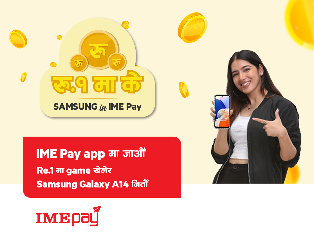 जेठ १० गते देखि जेठ १७ गतेसम्म चल्ने यस अफरमा आइएमई पे का सम्पूर्ण प्रयोगकर्ताहरूले केवल १ रुपैयाँमा सो खेल खेली सामसुङको ग्यालेक्सी ए–१४ ५ जी स्मार्टफोन जित्ने मौका पाउन सक्ने छन् ।