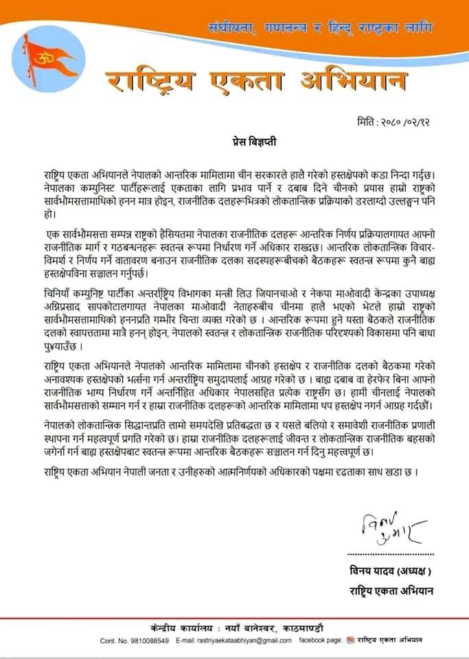 अभियानले प्रेस विज्ञप्ति जारी गर्दै नेपालका कम्युनिस्ट पार्टीहरूलाई एकताका लागि प्रभाव पार्ने र दबाब दिने चीनको प्रयास हाम्रो राष्ट्रको सार्वभौमसत्तामाथिको हनन मात्र होइन, राजनीतिक दलहरूभित्रको लोकतान्त्रिक प्रक्रियाको डरलाग्दो उल्लङ्घन पनि रहेको जनाएको छ ।