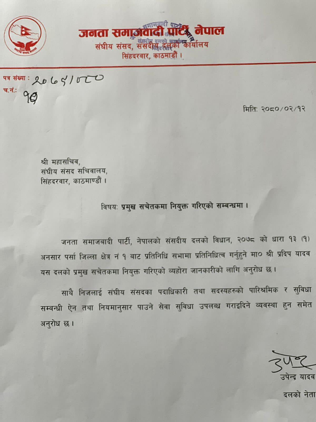 शुक्रबार जसपाका अध्यक्ष उपेन्द्र यादवले सांसद यादवलाई प्रमुख सचेतकको जिम्मेवारी दिएका हुन् ।