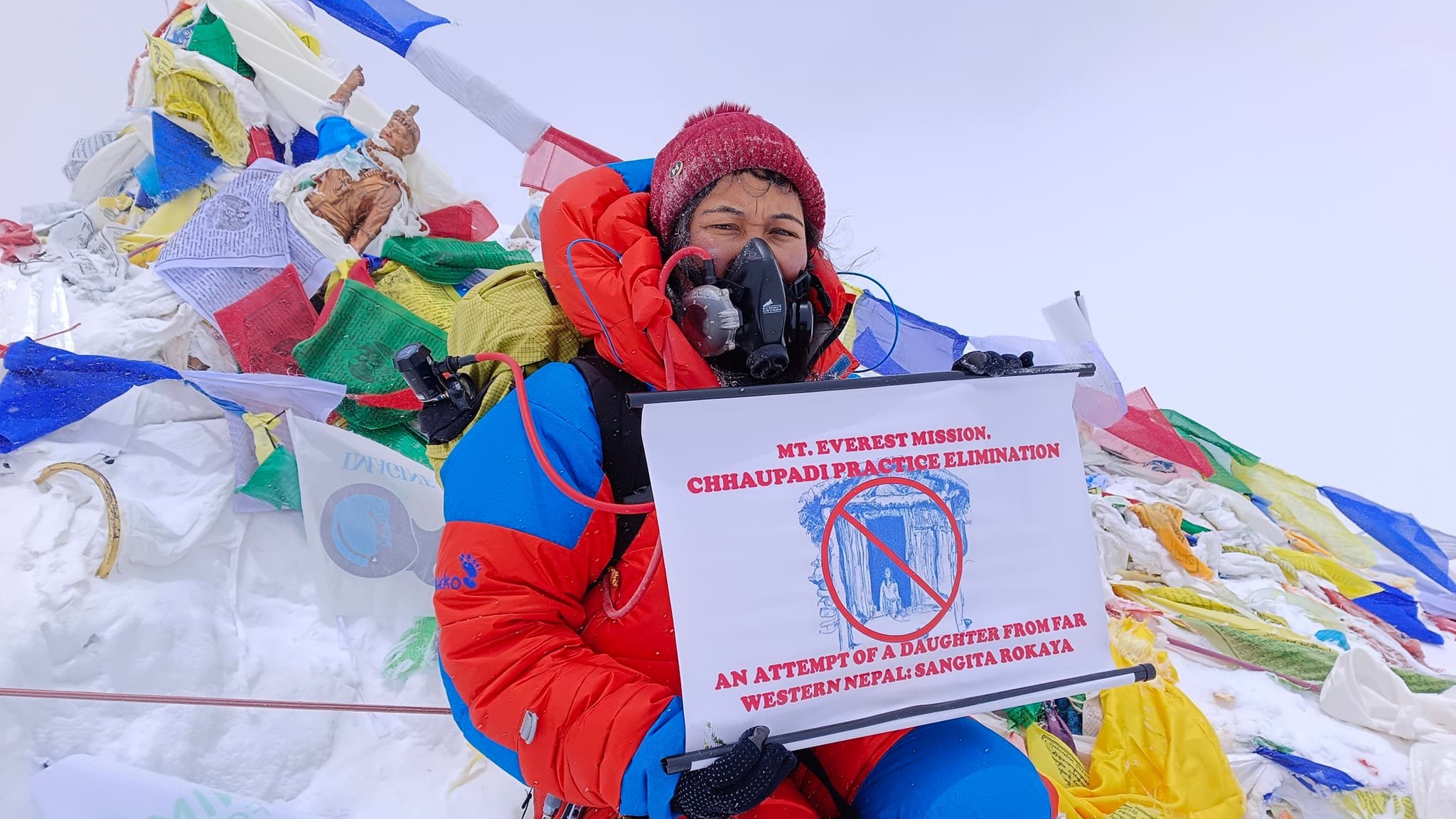बझाङ । साइपाल गाउँपालिका–४ धुलीकी सङ्गीता रोकाया ‘छाउपडी प्रथा अन्त्य’को सन्देशसहित सर्वोच्च शिखर सगरमाथाको चुचुरोमा पुग्ने पहिलो बझाङी हुन्। छब्बीस वर्षीया उनले पायोनियर एड्भेन्चर कम्पनीको सहयोगमा तीन भारतीय नागरिकसँगै यही जेठ ३ गते दिउँसो साढे १२ बजे सफल आरोहण गरिन्।