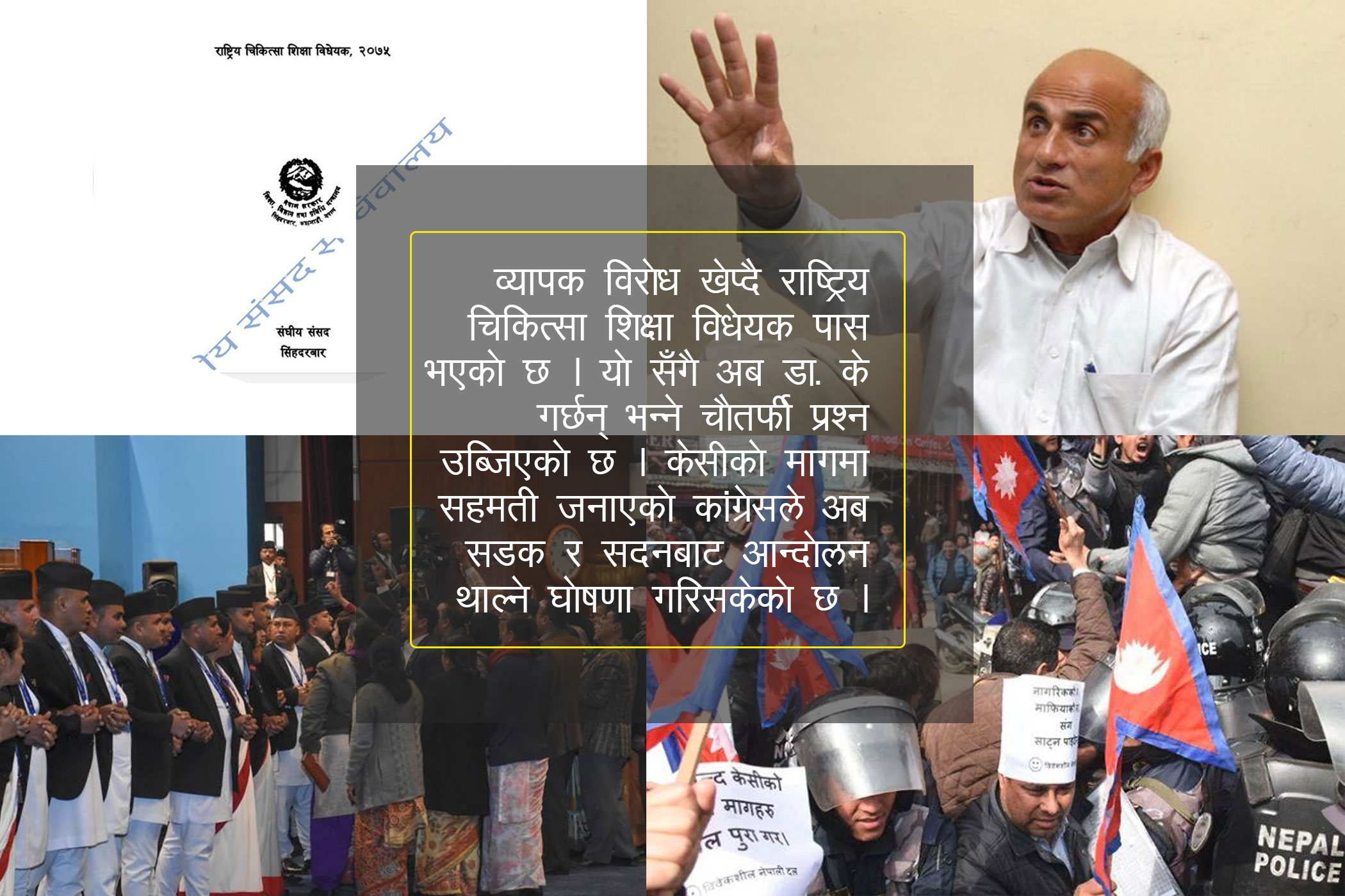 प्रमुख प्रतिपक्षी दल नेपाली कांग्रेसले चिकित्सा शिक्षा विधेयक र डा। केसीको जीवन रक्षाको माग गर्दै आन्दोलन गरिरहेको छ ।