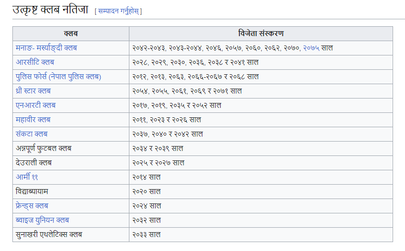 २०११बाट शुरु भएको लिगको अहिले ४४ औं संस्करणको लिग चलिरहेको छ । हालसम्म ‘ए’ डिभिजन लिगको उपाधिसबै भन्दा धेरै मनाङ मर्स्याङदी क्लबले जितेको छ । मनाङले हालसम्म ८ पटक कीर्तिमानी लिगको उपाधि जितेको छ । मनाङपछि आरसिटीले ६ पटक उपाधि जितेको छ । त्यस्तै नेपाल पुलिसले ५ पटक उपाधि आफ्नो नाममा गराएको छ भने एनआर्टीले ४ पटक यो उपाधि जितेको छ । त्यस्तै, थ्रि स्टार र संकटाले भने हालसम्म समान ३ ३ पटक उपाधि जितेका छन् ।