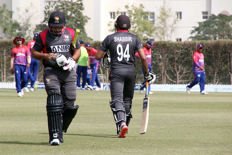 युएईका लागि ओपनर ब्याट्सम्यान आश्फाक अहमेद मात्र २ रन बनाएर आउट भए । उनलाई नेपालका सन्दिप लामिछानेले क्याच आउट गरे । त्यस्तै अर्का ओपनर ब्याट्सम्यान सिपी रिज्वान २२ रन बनाएर पेभेलियनमा फर्किए ।