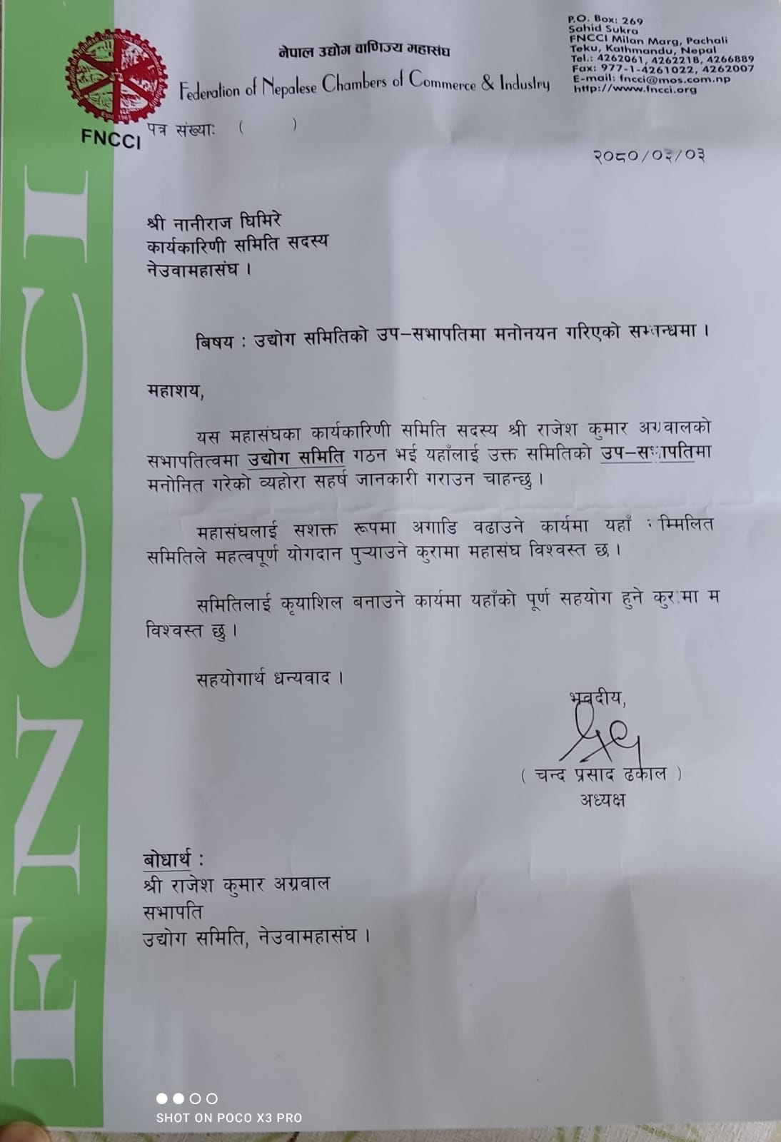 काठमाडौं । नेपाल उद्योग वाणिज्य महासंघका अध्यक्ष चन्द्र प्रसाद ढकालले महासंघको उद्योग समितिको उप सभापतिमा नानीराज घिमिरेलाई मनोनित गरेका छन् ।