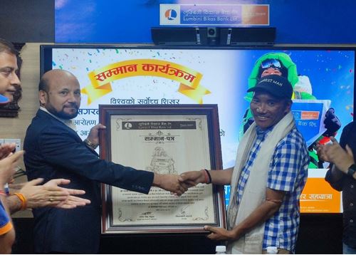 आरोहणको क्रममा लुम्बिनी विकास बैंकको लोगो अंकित ब्यानर सहित उच्च शिखरमा पुगी आफ्नो नाम पुनः गिनिज बुक अफ वल्र्ड रेकर्डस मा लेखाउन सफल हुनुभएकोमा विकास बैंकले आज मिती २०८० जेठ ८ गते सम्मान कार्यक्रमको आयोजना गरी उनको उत्तरोत्तर प्रगतिको कामना सहित सम्मान–पत्र प्रदान गरेको छ । सो सम्मान–पत्र बैंकका अध्यक्ष श्री चिन्तामणि भट्टराईज्यूले विकास बैंकको केन्द्रीय कार्यालय डिल्लीबजारमा एक कार्यक्रमका बीच प्रदान गरेका छन् ।