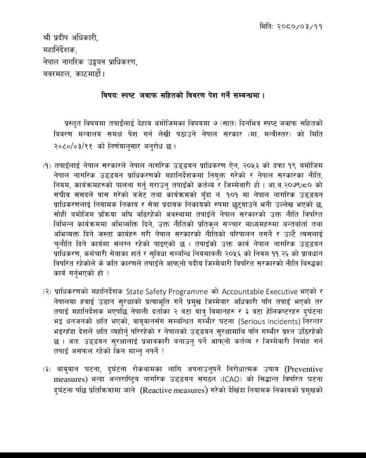 काठमाडौं । संस्कृति, पर्यटन तथा नागरिक उड्डयनमन्त्री सुदन किरातीले नेपाल नागरिक उड्ड्यन प्राधिकरणका महानिर्देशक प्रदीप अधिकारीलाई ९ बुँदे स्पष्टीकरण सोधेका छन् ।