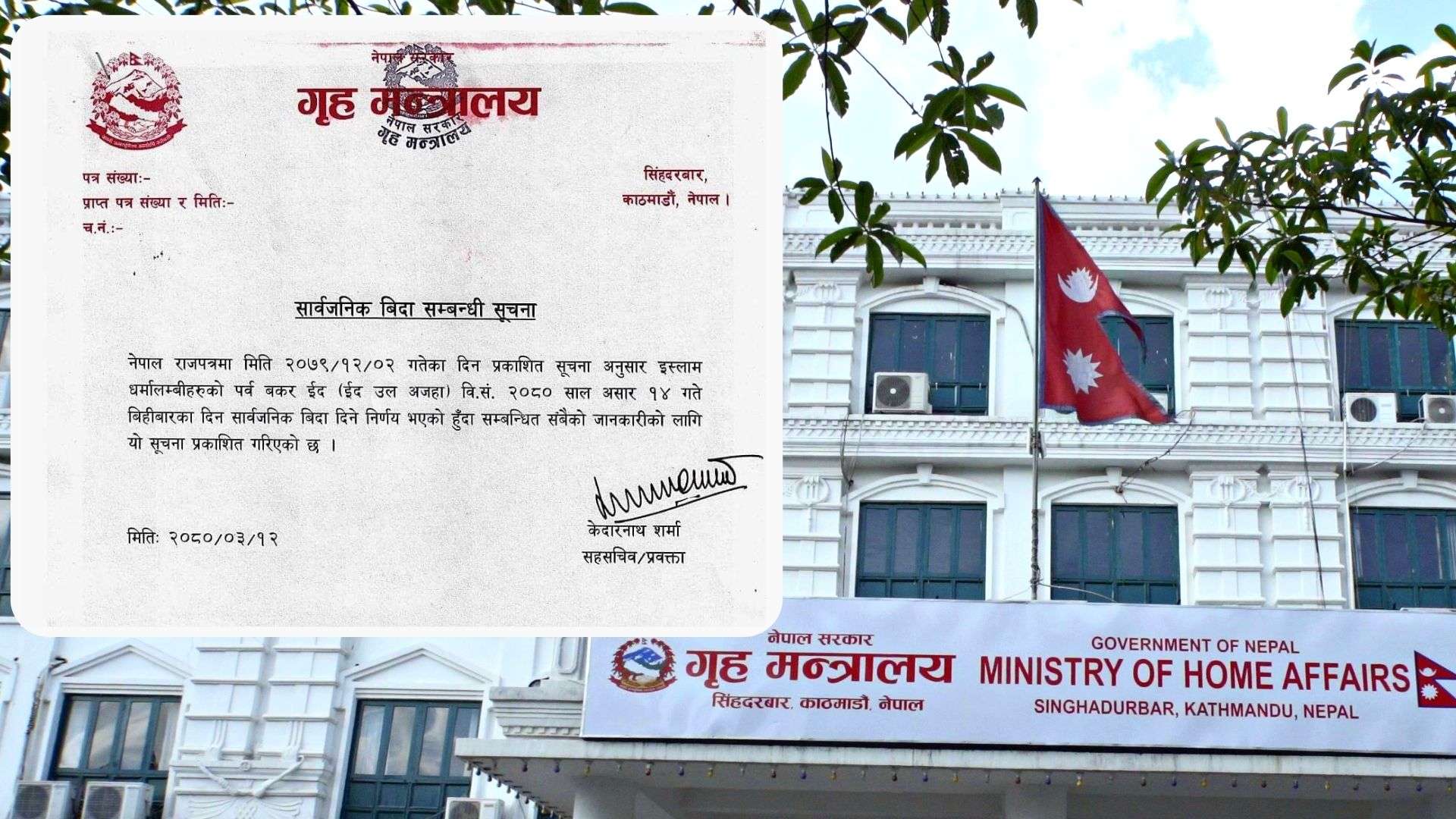 काठमाडौं । नेपाल सरकारले बिहीबार सार्वजनिक बिदा दिने भएको छ । मंगलबार गृह मन्त्रालयले सुचना जारी गर्दै इस्लाम धर्मालम्बीहरुको पर्व बकर ईद (ईद उल अजहा ) को उपलक्षमा सार्वजनिक बिदा दिने निर्णय गरेको जानकारी दिएको हो ।