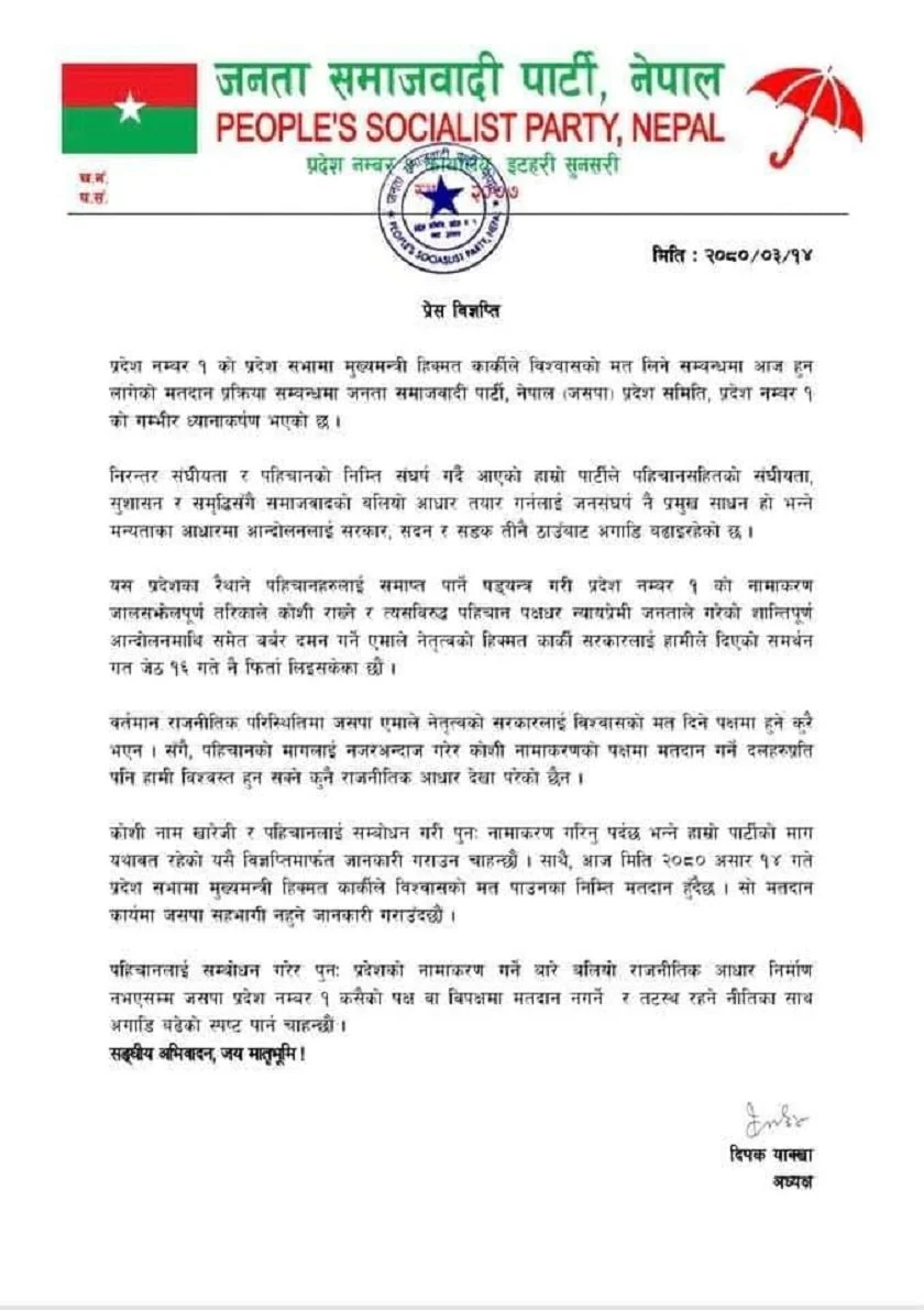 विज्ञप्तिमा कोशी नामकरणमा सहयोग गर्ने कुनै पनि दलको नेतृत्वलाई अस्वीकार गर्ने उल्लेख छ । मुख्यमन्त्री कार्कीले आज प्रदेश सभामा विश्वासको मत लिने कार्यसूची छ ।