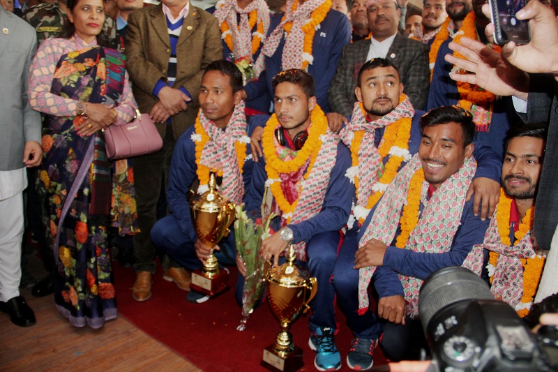 पारस खड्का नेतृत्वको नेपाली टोली त्रिभुवन अन्तर्राष्ट्रिय विमानस्थलमा खेलाडीहरुको स्वागतमा रेड कार्पेट विछ्याइको हो । यसको प्रवन्ध राष्ट्रिय खेलकुद परिषद (राखेप)ले गरेको हो ।