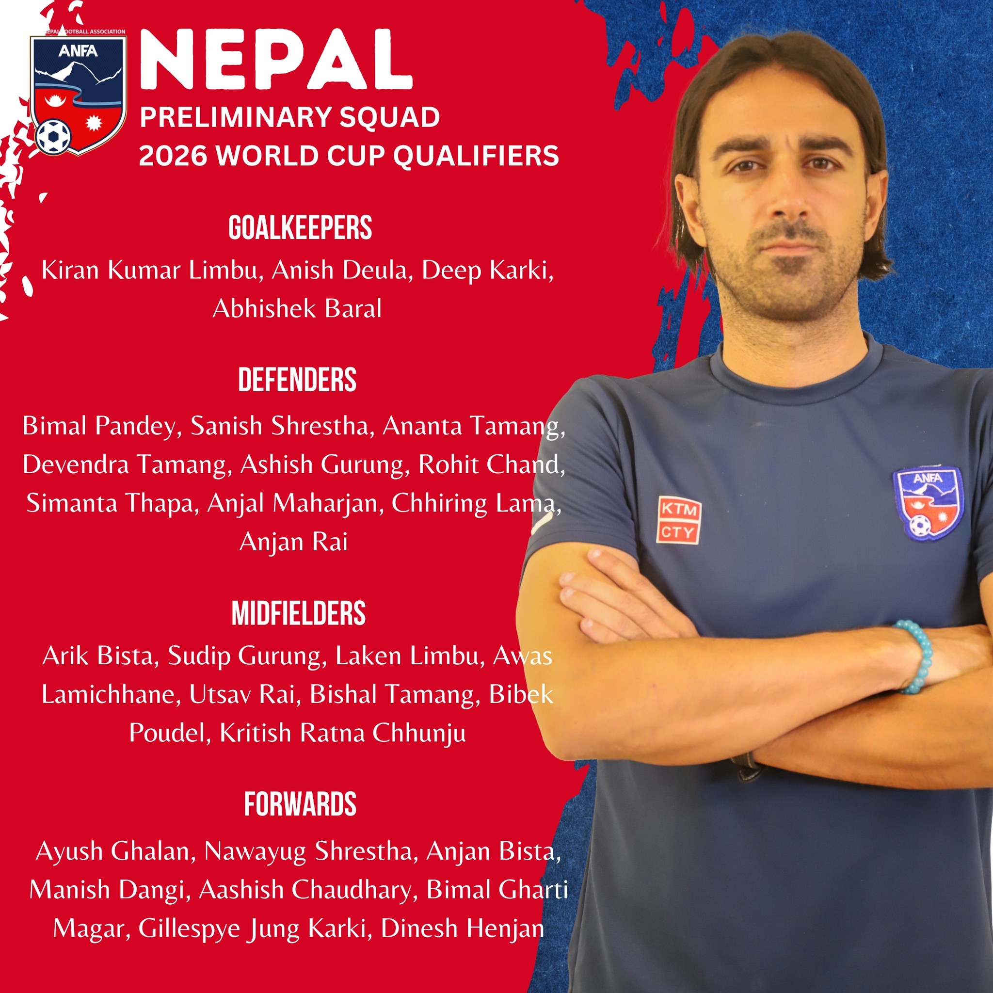 मुख्य प्रशिक्षक भिसेन्जो अल्बर्टोले आज (आइतबार) फिफा विश्वकप छनोट खेल्ने प्रारम्भिक ३० खेलाडीको नाम घोषणा गरेका हुन् ।