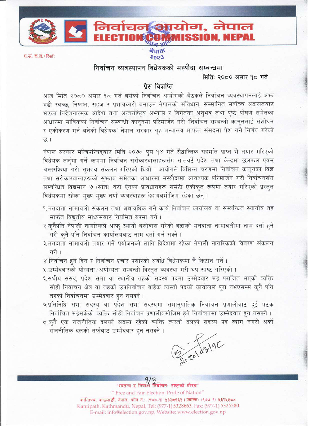 आयोगको सोमबार बसेको बैठकले निर्वाचनसम्बन्धी कानुनलाई संशोधन र एकीकरण गर्न बनेको विधेयकको मस्यौदा पास गरेको छ ।