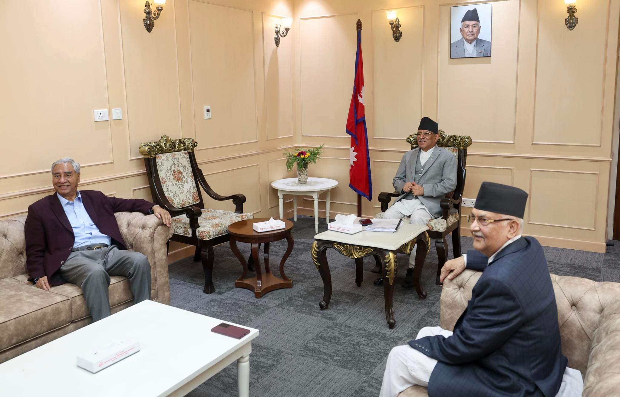 अहिले प्रधानमन्त्री पुष्पकमल दाहाल प्रचण्डसँग एमाले अध्यक्ष केपी शर्मा ओली र कांग्रेस सभापति शेरबहादुर देउवाबीच छलफल जारी रहेको छ ।