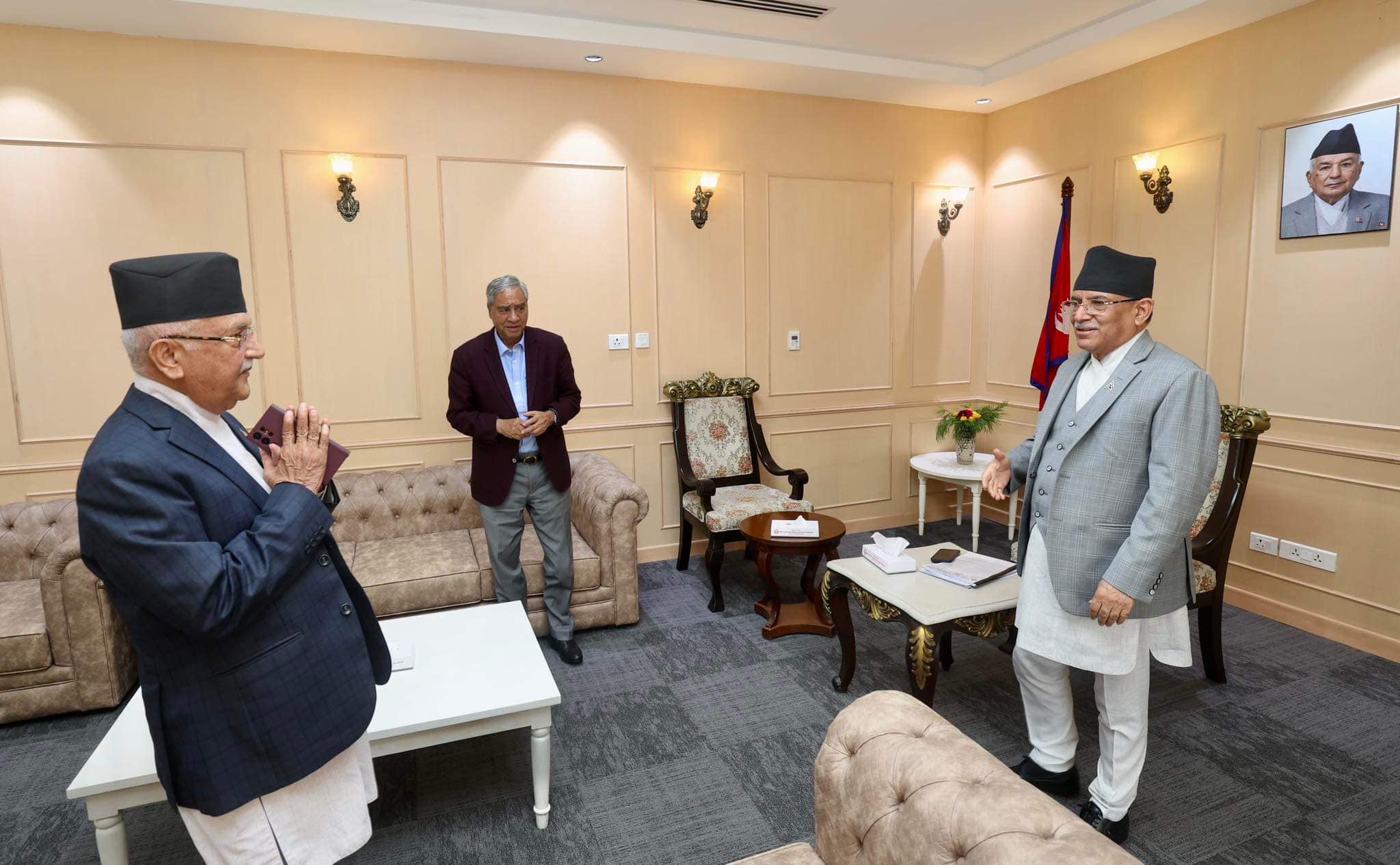 अहिले प्रधानमन्त्री पुष्पकमल दाहाल प्रचण्डसँग एमाले अध्यक्ष केपी शर्मा ओली र कांग्रेस सभापति शेरबहादुर देउवाबीच छलफल जारी रहेको छ ।