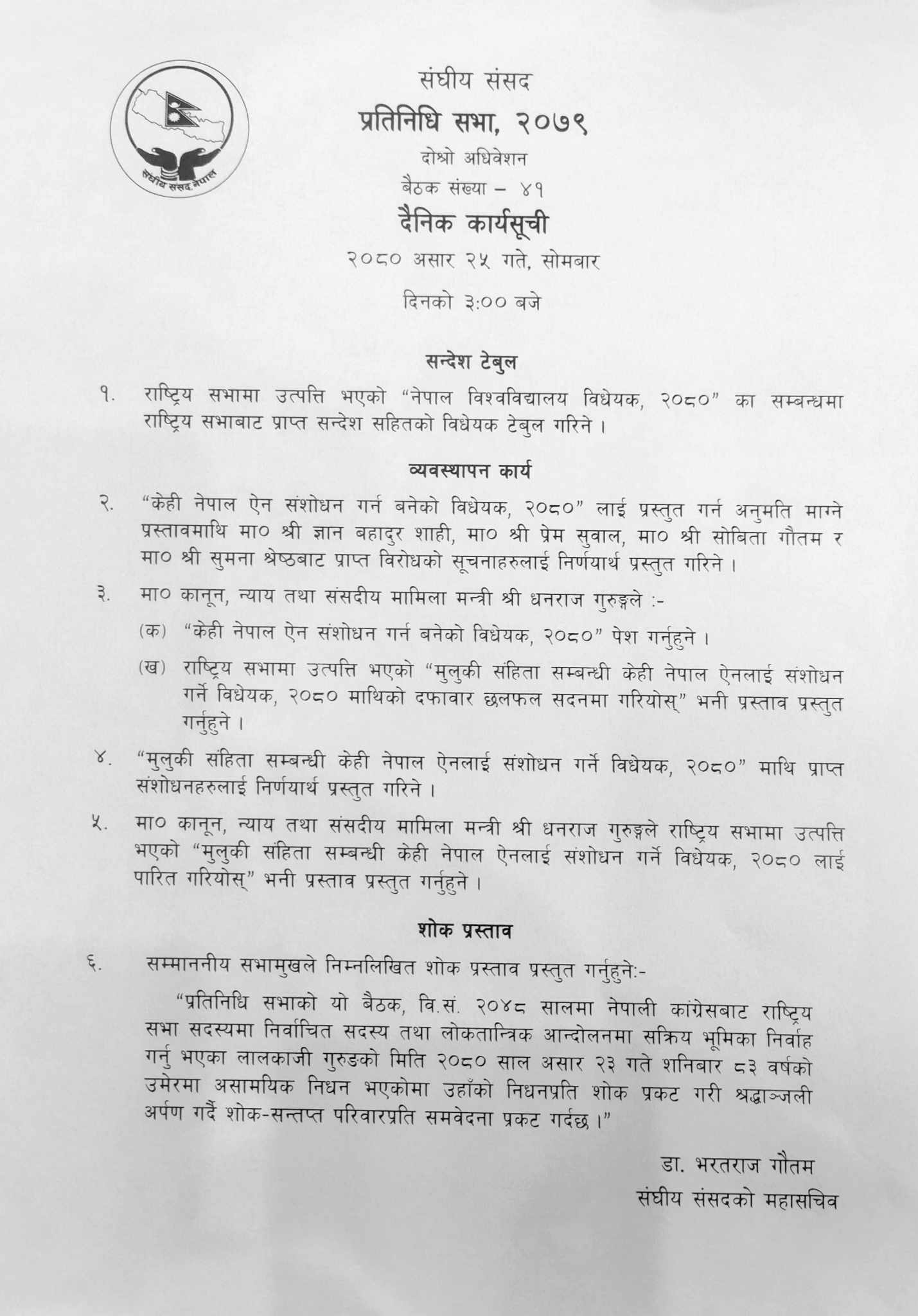 त्यसैगरी केही नेपाल ऐन संशोधन गर्न बनेको विधेयक, २०८० लाई प्रस्तुत गर्न अनुमति माग्ने प्रस्तावमाथि सांसदहरुबाट आएका विरोधका सूचनाहरुलाई निर्णायार्थ प्रस्तुत गरिने लगायतका कार्यसूची रहेको छ ।