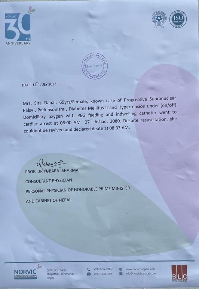 थापाथलीस्थित नर्भिक अन्तर्राष्ट्रिय अस्पतालमा उपचारका क्रममा ६९ वर्षको उमेरमा दाहालको आज बिहान ८ बजेर ३३ मिनेटमा निधन भएको प्रधानमन्त्री दाहालका निजी चिकित्सक प्रा डा युवराज शर्माले जानकारी दिए ।
