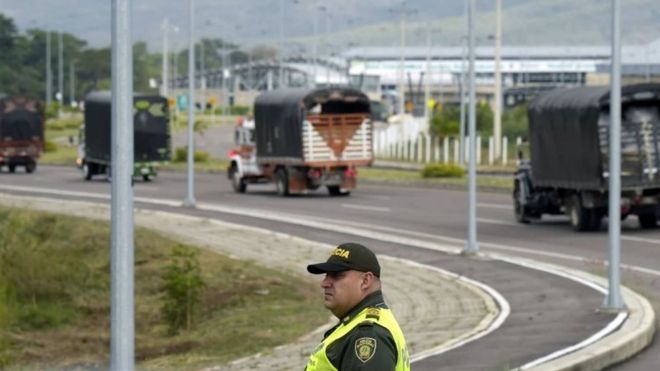 अमेरिकाले उपलब्ध गराएको खाद्यान्न र औषधि बोकेका लरीहरु कोलम्बिया सुरक्षाकर्मीले स्कर्टिङ गरेर सीमा क्षेत्रमा पु-याएका हुन् । भेनेजुएलाका अधिकारीहरुले अमेरिकाले पठाएको मानवीय सहायता अस्वीकार गर्दै ती लरीलाई सीमा क्षेत्रमै रोकेका छन् ।