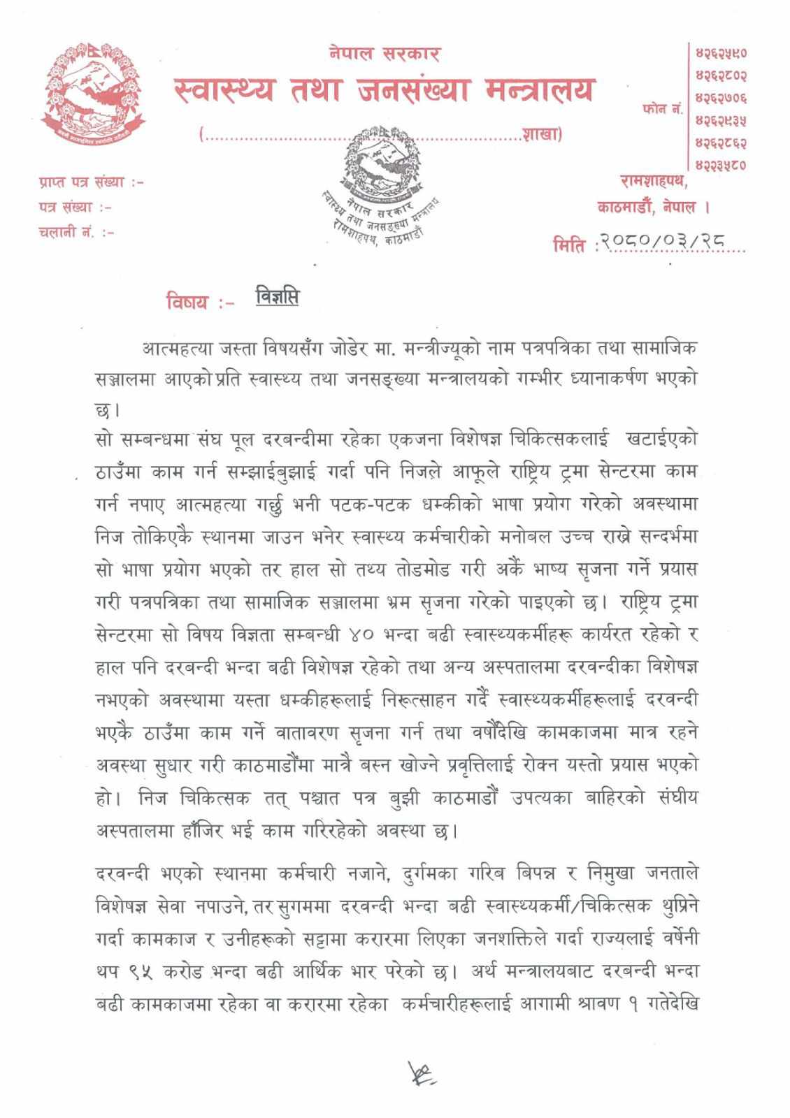 मन्त्रालयले बिहीबार विज्ञप्ति जारी गर्दै दरबन्दी अनुसार स्वास्थ्यकर्मीको सरुवा र दुुर्गममा स्वास्थ्यकर्मी पठाउने प्रयासलाई गलत तरिकाले प्रचार गरिएको भन्दै आपत्ति जनाएको हो ।