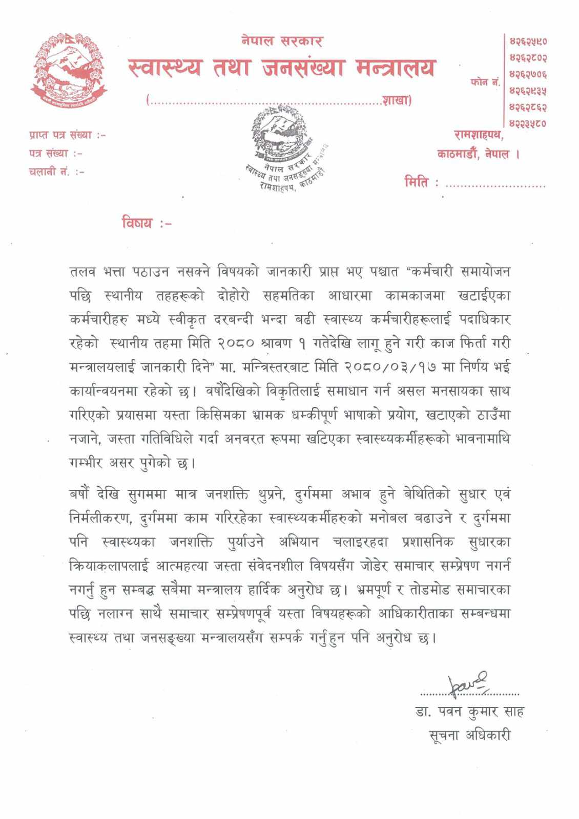 अर्थमन्त्रालयबाट आगामी साउन १ गतेबाट दरबन्दी भन्दा बढी कामकाजमा रहेका वा करारमा रहेका कर्मचारीहरुलाई तलब भत्ता पठाउन नसक्ने स्वास्थमन्त्रालाई पत्र पठाएको थियो । तोकिएको दरबन्दीमा जान नमान्ने कर्मचारीहरुलाई कानुनी दायरामा ल्याउने र असल नियतका कर्मचारीलाई प्रोत्साहन गर्न गरिएको प्रयासमा गलत भाषा प्रयोग गरिएको भन्दै मन्त्रालयले आपत्ति जनाएको हो ।