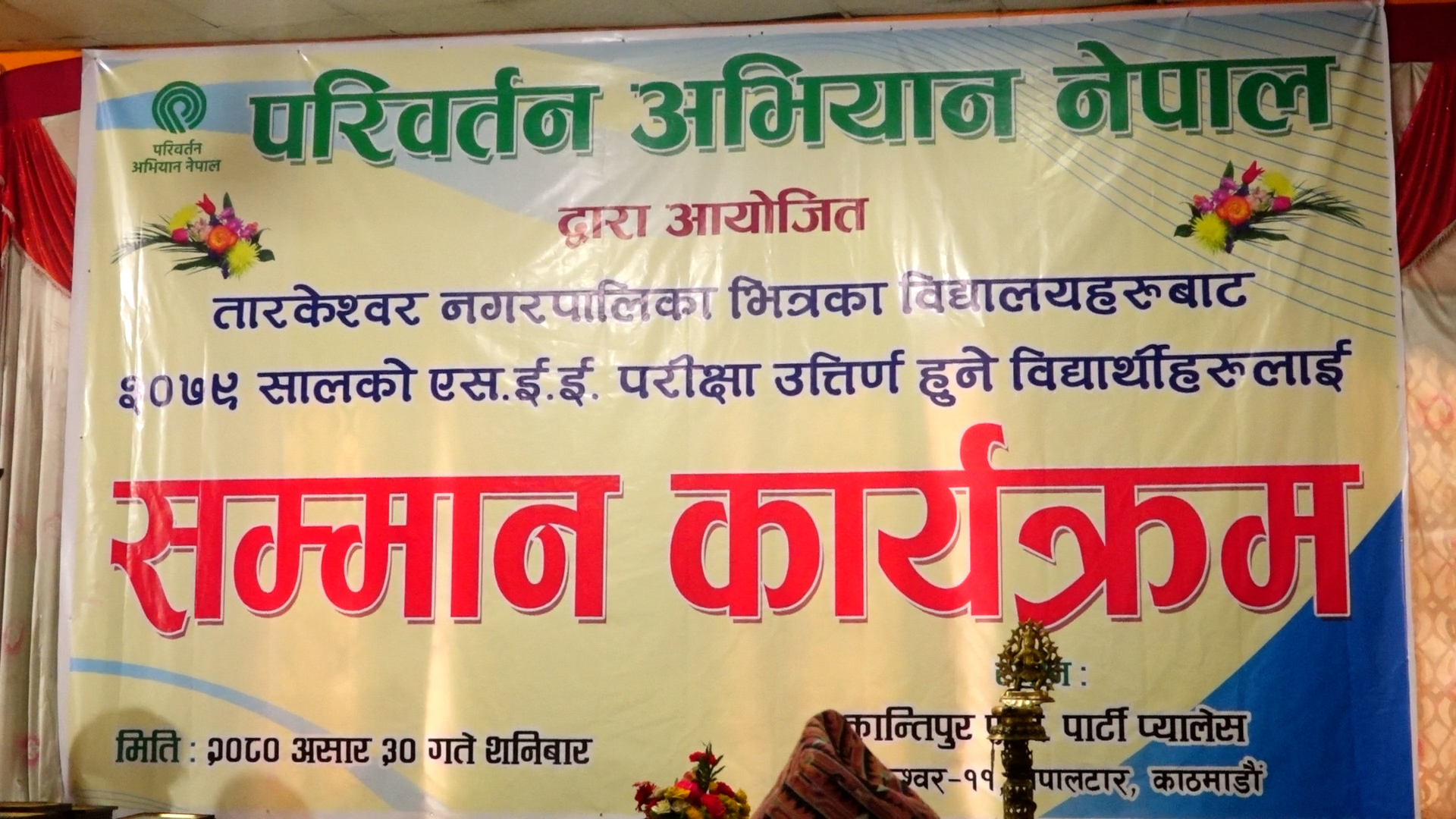 काठमाडौं । परिवर्तन अभियान नेपालले काठमाडौँको तारकेश्वर नगरपालिकाबाट माध्यामिक शिक्षा परीक्षा (एसईई) उत्तीर्ण छात्रछात्रा र विद्यालयलाई सम्मानित गरेको छ । शनिबार राजधानीको नेपालटारमा आयोजित कार्यक्रमका बीच सामुदायिक र संस्थागत विद्यालय तथा छात्रछात्रालाई सम्मानित गरिएको हो ।