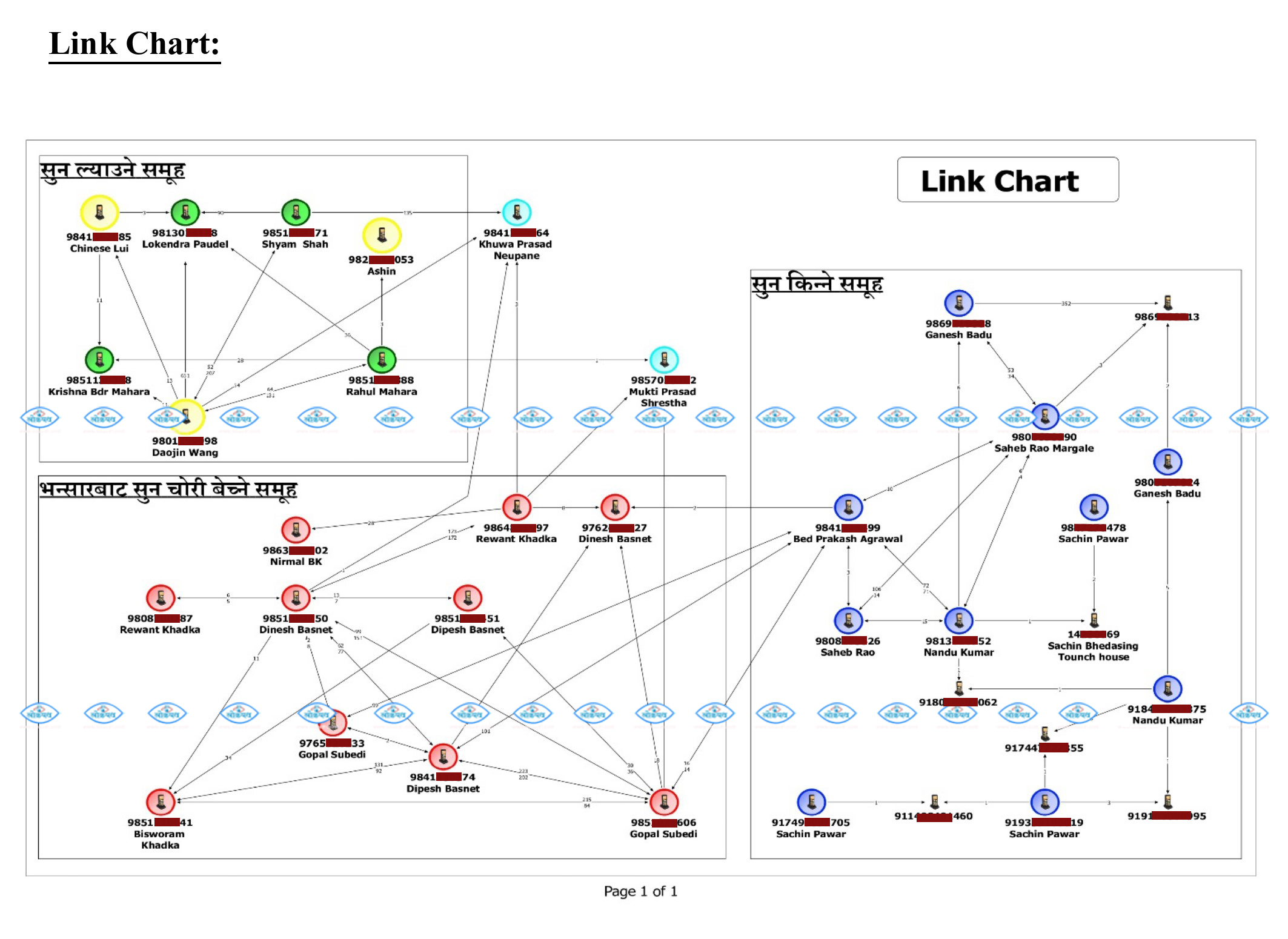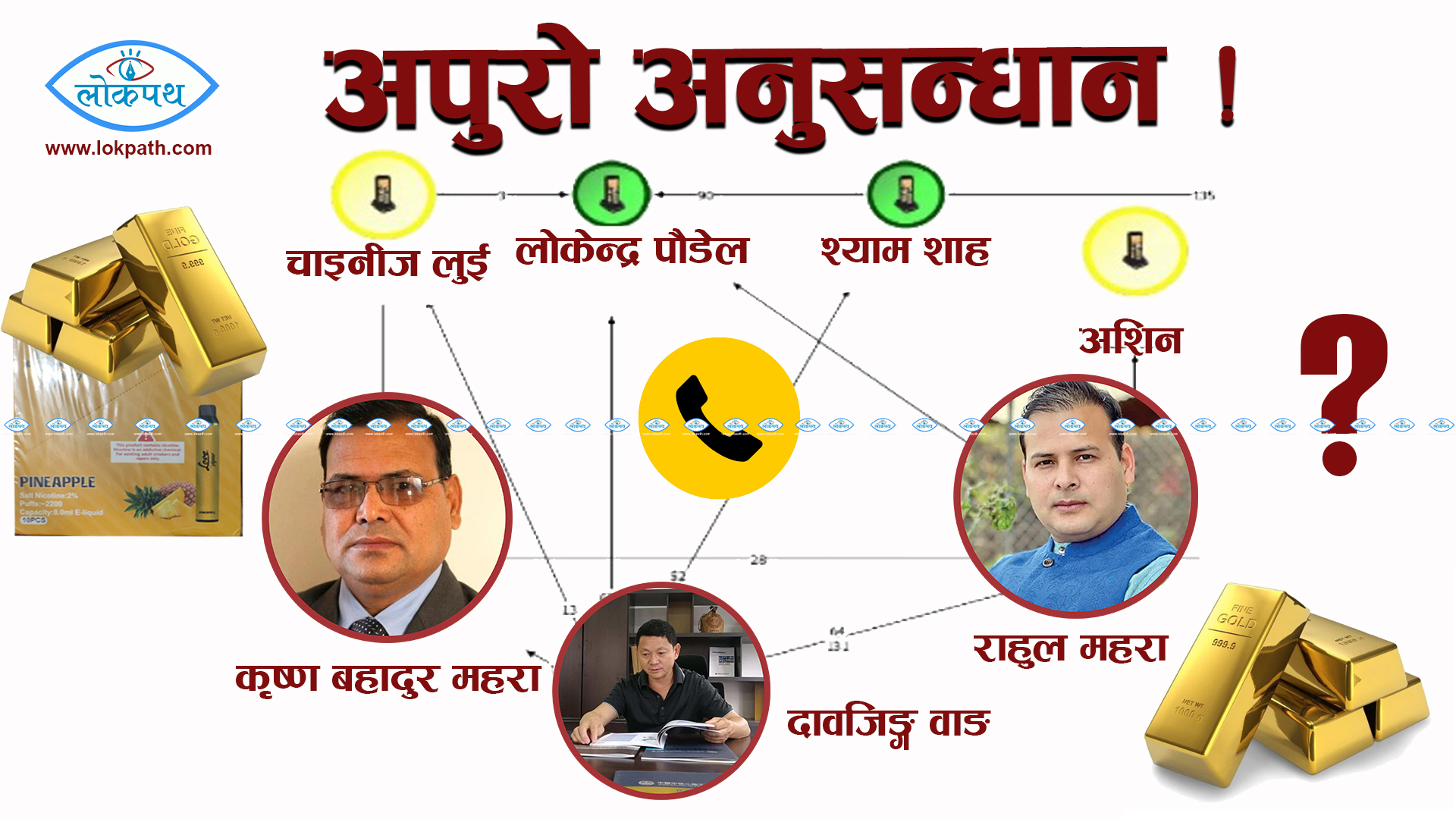 सुन तस्करीका मुख्य व्यक्ति लुईले माओवादी केन्द्रका नेता कृष्ण बहादुर महरासँग ११ पटक र अर्का तस्कर वाङले पनि महरासँग ११ पटक नै कुराकानी गरेको पाइएको छ । त्यसरी वाङले राजस्व तिरेर वा लिलामी मिलाएर छुटाइदिने भन्दै सम्पर्कमा आएका श्याम साहसँग २५३ पटक कुराकानी गरेका छन् । वाङ र भन्सार एजेन्ट खुवाप्रसाद न्यौपानेबीच ५४ पटक कुराकानी भएको छ । राहुल महराले वाङका सवारीचालक लोकेन्द्र पौडेलसँग ३६ पटक कुराकानी गरेका छन् भने चिनियाँ नागरिक अशिनसँग ३ पटक र भन्सार अधिकृत मुक्तिप्रसाद श्रेष्ठसँग एकपटक कुराकानी गरिएको अनुसन्धान प्रतिवेदनमा उल्लेख छ ।