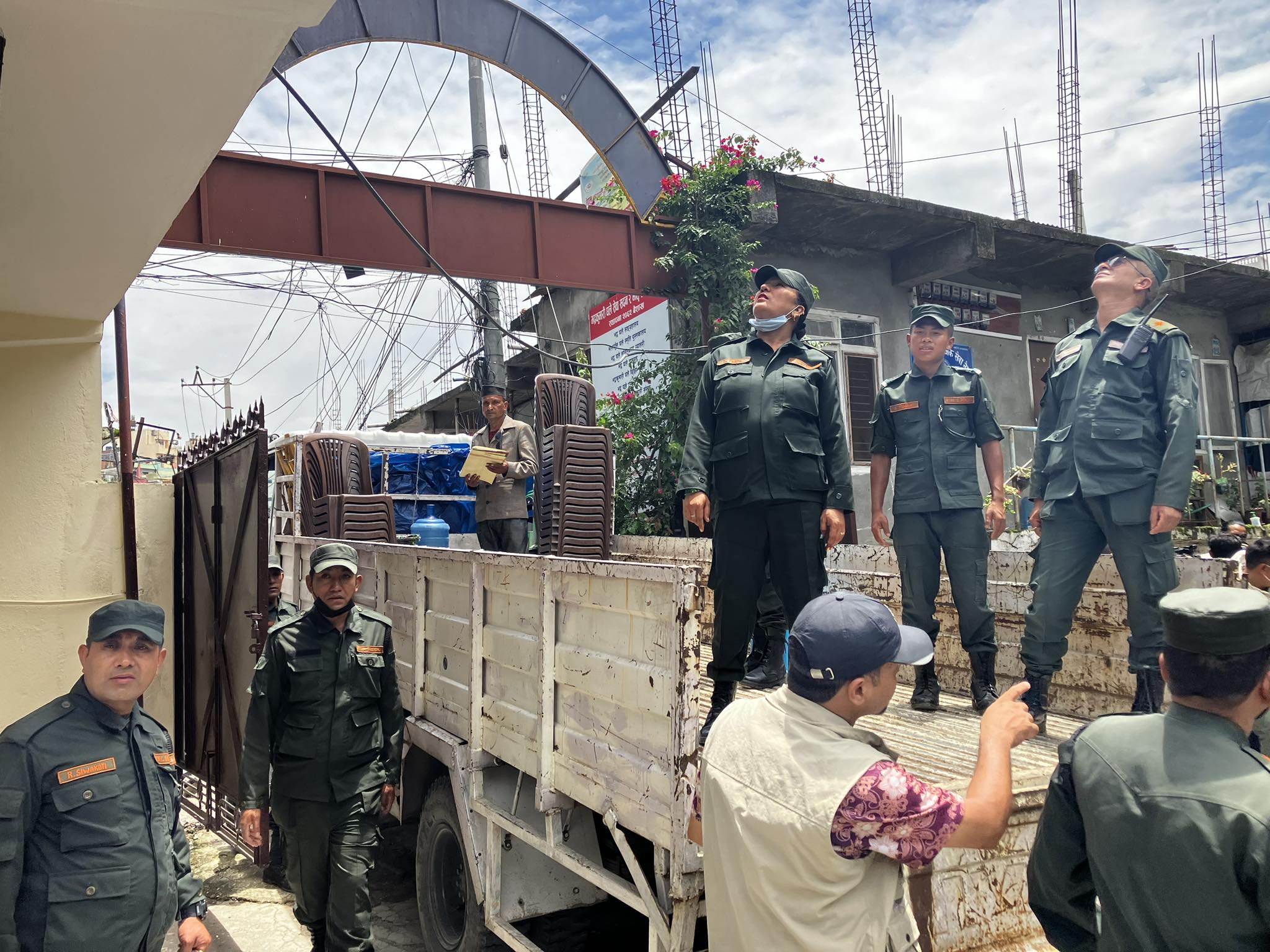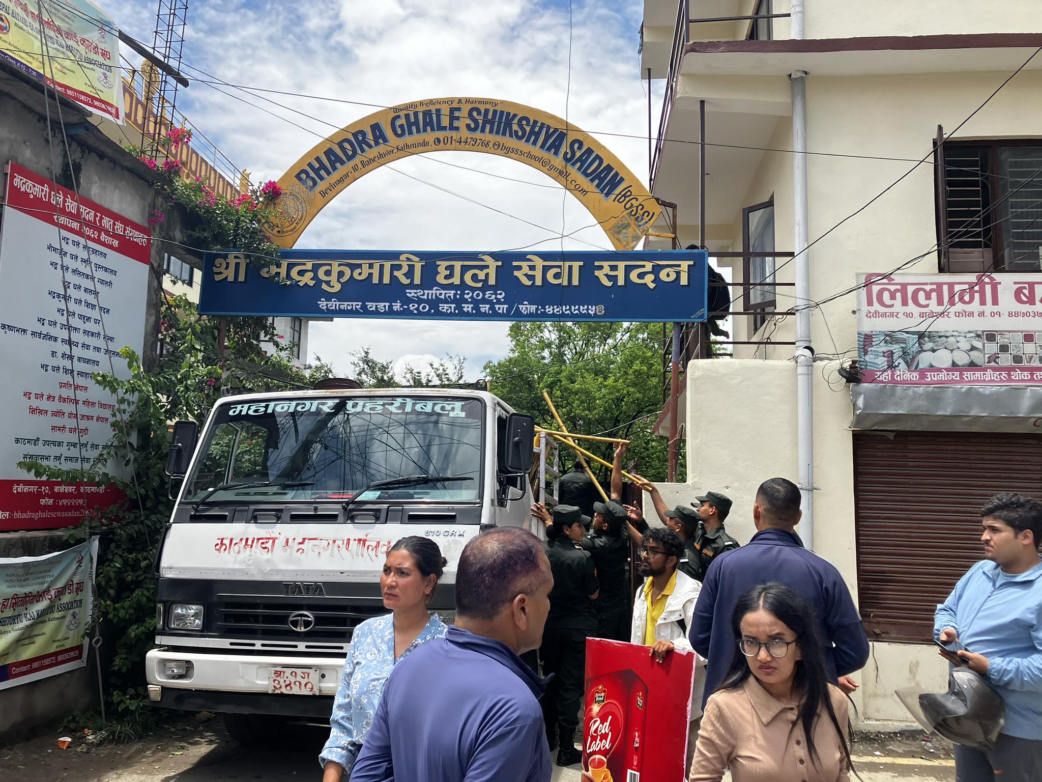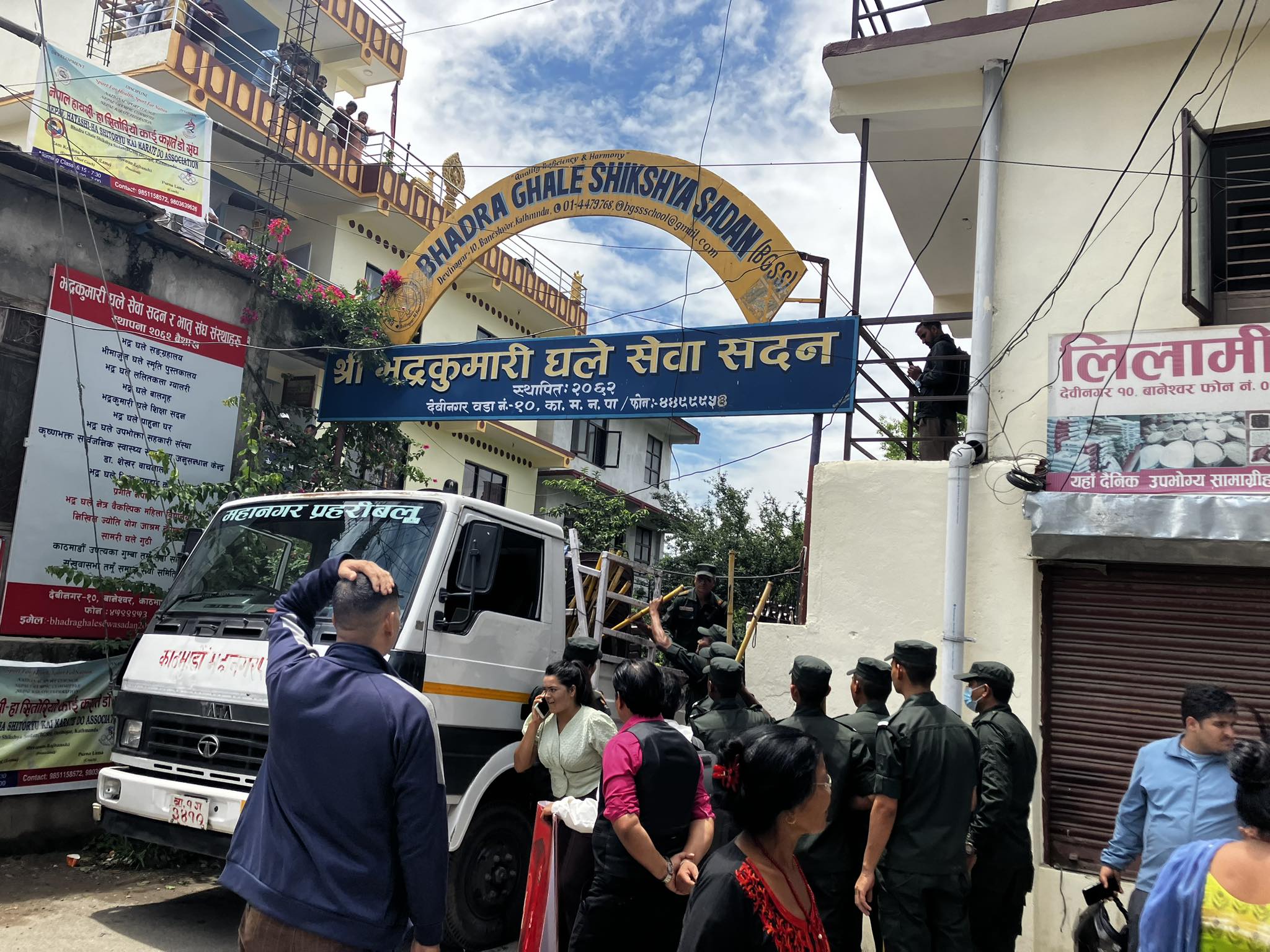 सार्वजनिक जग्गा कब्जा गरी भद्रकुमारी घले सेवा सदन सञ्चालन गरेको भन्दै महानगर प्रहरीले उक्त भवन खाली गराउन लागेको हो । नगरप्रहरीले केही बेरमा डोजर चलाउने तयारी गरेको छ ।