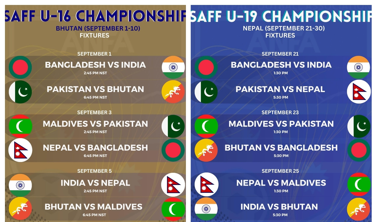 काठमाडौं । दक्षिण एसियाली फुटबल महासङ्घ (साफ)ले भुटानमा आयोजना हुने यु–१६ पुरुष साफ च्याम्पियनसिप फुटबल प्रतियोगिताको खेल तालिका आज सार्वजनिक गरेको छ ।