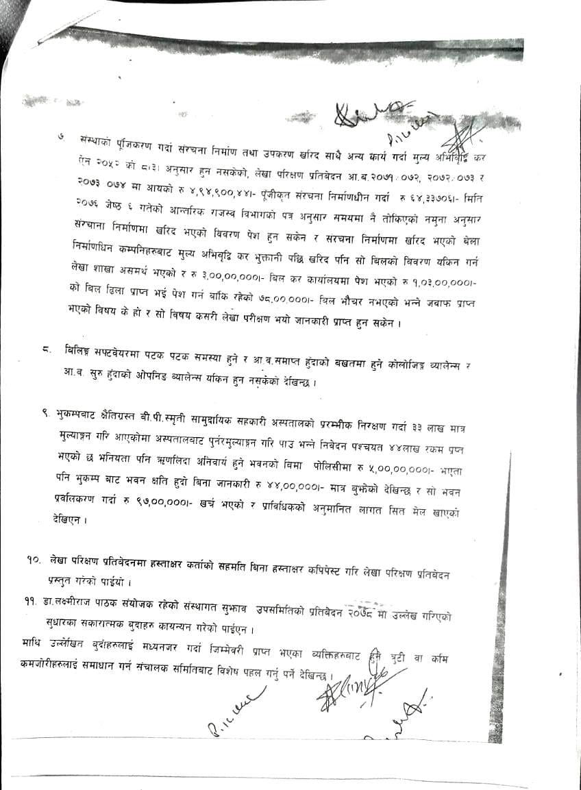 यसैगरी, समितिका पदाधिकारी र प्रमुख कार्यकारी अधिकृतलाई करका विषयमा लेखा शाखाले मौखिक जानकारी गराएर पत्रसमेत उपलब्ध गराउँदासञ्चालक समितिले कुनै पहल नगरेको समितिको ठहर छ । त्यस्तै, संस्थाले घर जग्गा खरिद गर्दा संस्थाले तिर्नुपर्ने राजश्व सहकारी विभागबाट २०७१ जेठ २९ गते रजिष्ट्रेशन दस्तुर तथा राजश्व छुटको पत्र प्राप्त भएको तर घर जग्गा के कति मूल्यमा खरिद गरिएको हो सो बारेमा नखुलाइएको प्रतिवेदनमा उल्लेख छ ।