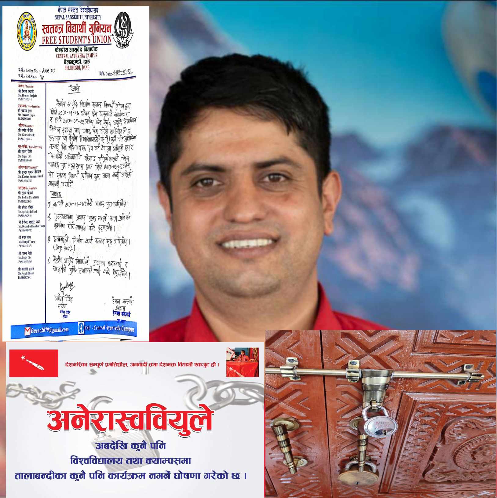 दाङ । नेपाल संस्कृत विश्वविद्यालयको मूलगेटमा एमाले निकट अनेरास्ववियुबाट निर्वाचित स्ववियु सभापति र सचिवले तालाबन्दी गरेका छन् ।