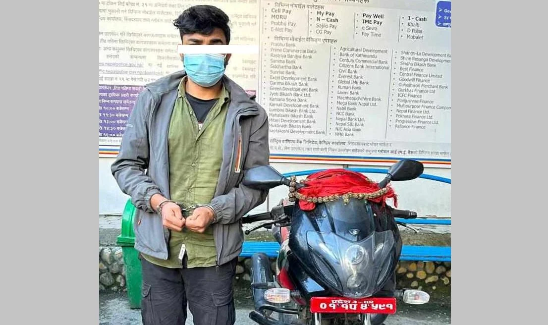 काठमाडौं । काठमाडौंको तारकेश्वर नगरपालिका ५ गुम्बाबाट चोरीको मोटरसाइकल सहित एक जनालाई ट्राफिक प्रहरीले नियन्त्रणमा लिएको छ । नियन्त्रणमा आउनेमा काठमाडौंकै गोलढुङ्गा बस्ने गोरखाको पालुङटार नगरपालिका १ का २६ वर्षीय दिनेश गिरी रहेका छन् ।