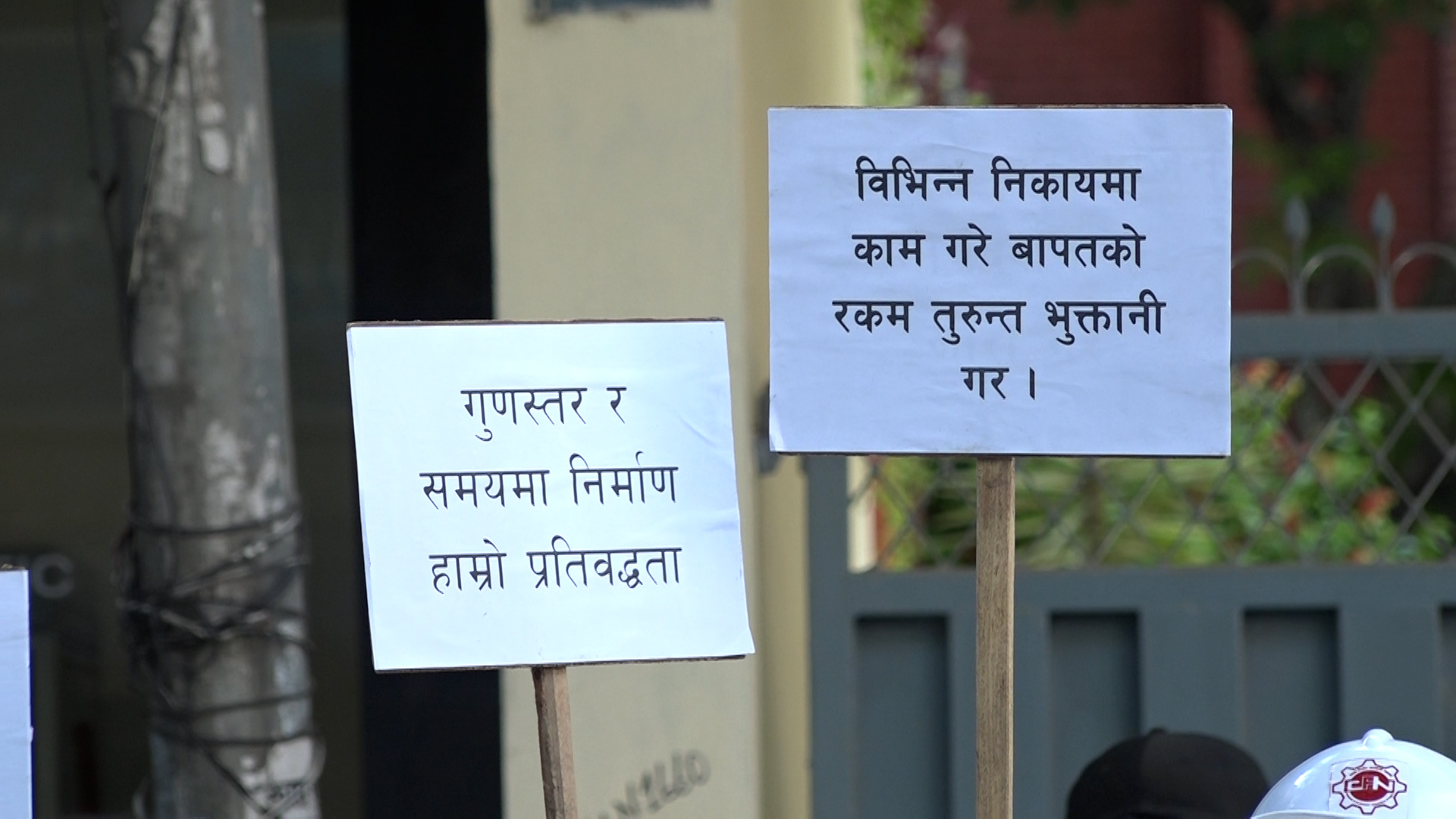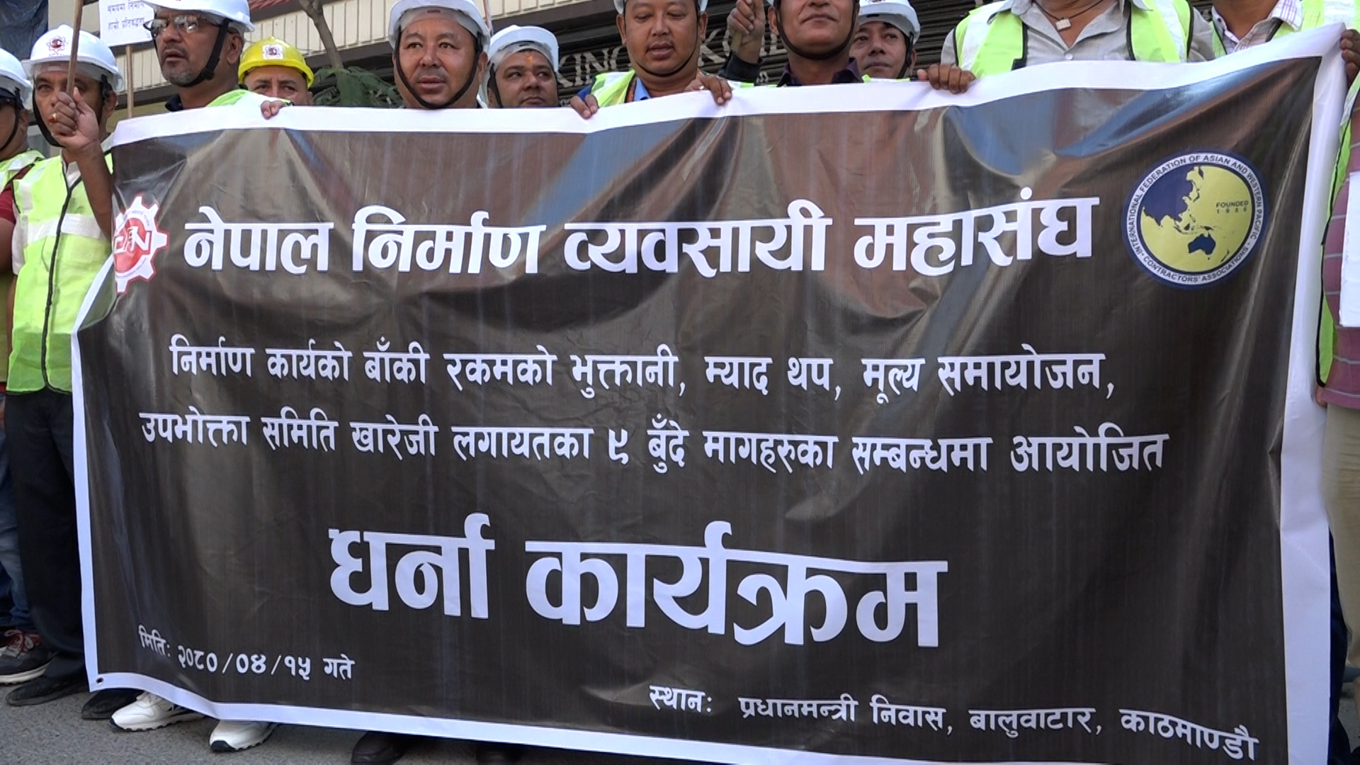 काठमाडौं । नेपाल निर्माण व्यवसायी महासंघ सरकारले आर्थिक वर्ष सकिंदा पनि ठूलो रकम भुक्तान नगरेको भन्दै आन्दोलनमा उत्रिएको छ । रकम निकासको मागसहित धर्ना र विरोधका कार्यक्रम गर्दै आएको महासंघले आज(सोमबार) बिहान प्रधानमन्त्रीको सरकारी निवास अघि धर्ना दिएका हुन् ।
