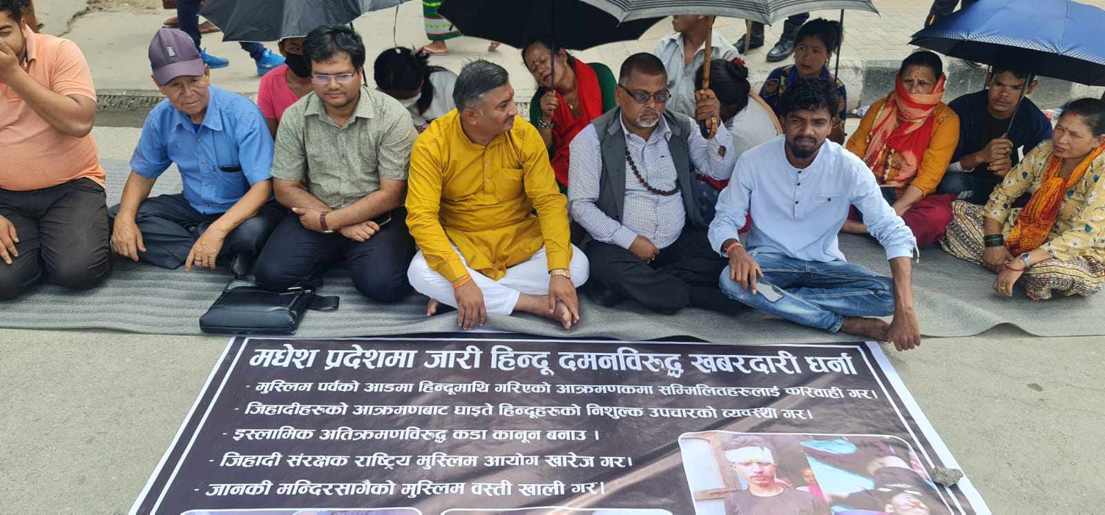 ‘‘मधेश प्रदेशमा जारी हिन्दू दमनविरुद्ध खबरदारी धर्ना’ लेखिएको ब्यानरसहित धर्नामा बसेका सहभागिहरु हिन्दुमाथि ज्यादती भईरहेको भन्दै विरोध समेत गरेका थिए ।