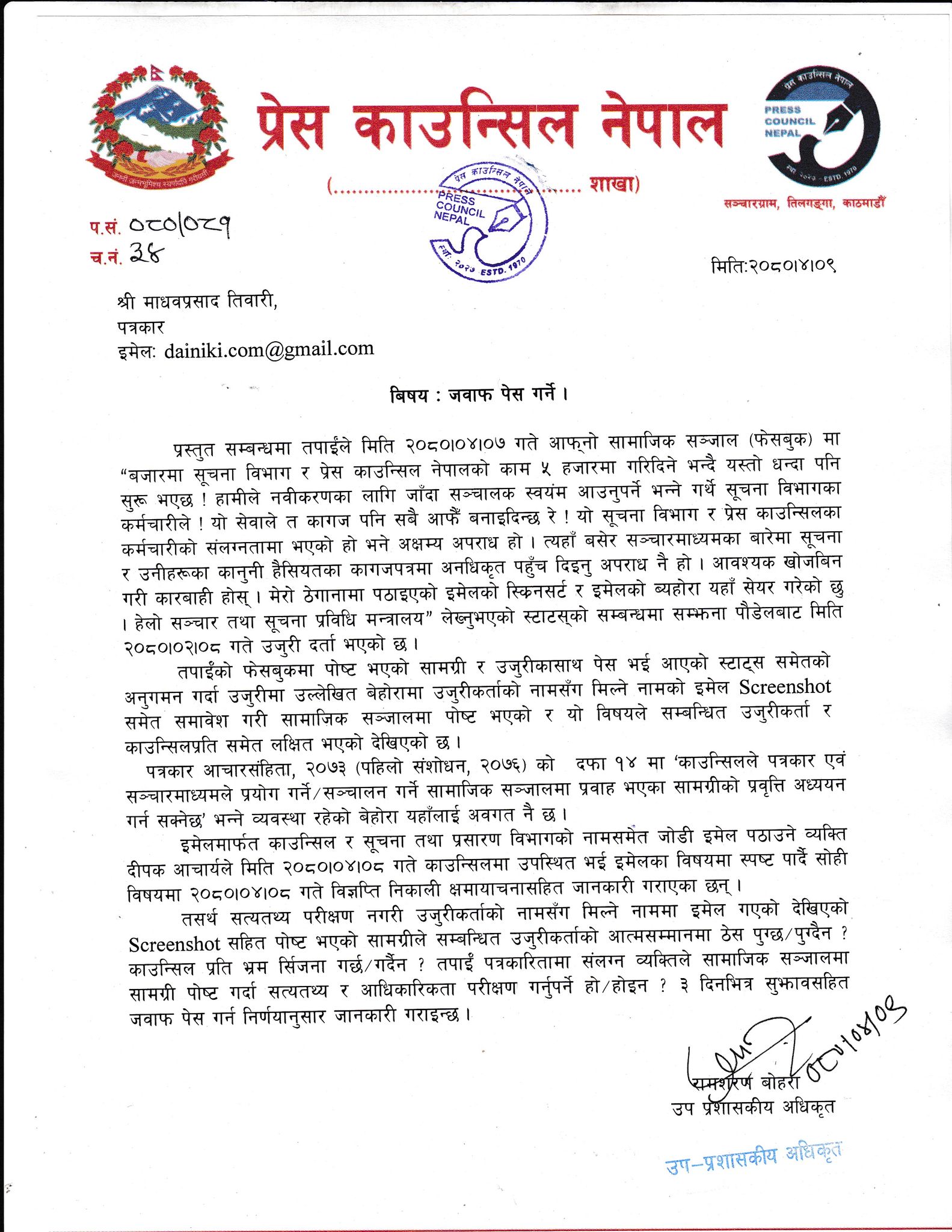 विज्ञप्तीमा भनिएको छ, ‘मालपोत र यातायात कार्यालयमा निश्चित पैसा लिएर काम गरिदिन्छु भन्दै सेवाग्राहीलाई हैरानी गर्ने विचौलियाले जस्तै प्रेस काउन्सिलमा समेत काम गरीदिन्छु भन्दै खुलेआम रुपमा इमेल गर्न थालेपछि उठाइएको प्रश्न पछि यस बिषयमा आवश्यक छानविन गरी दोषीलाई कारवाही गर्नुपर्नेमा उल्टै जवाफ पेश गर्न भन्दै प्रश्न उठाउने व्यक्तिलाई पत्र काटिनु खेदजनक छ । यसले काउन्सिलकै कर्मचारी पदाधिकारीको संलग्नताको शंका जन्मिएको छ ।’